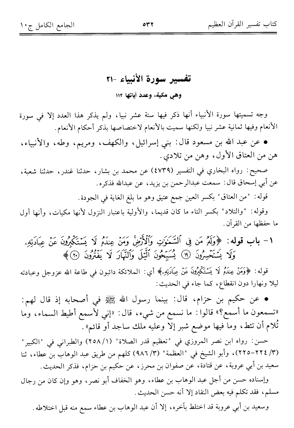 ٢١ - تفسير سورة الأنبياء وهي مكية، وعدد آياتها ١١٢
