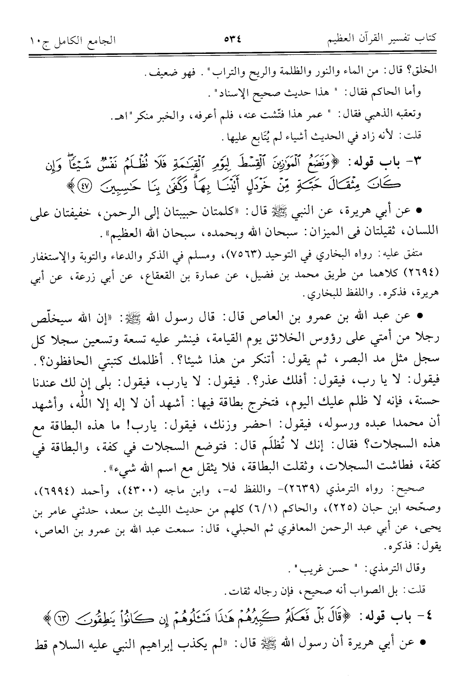 • عن عبد الله بن عمرو بن العاص قال: قال رسول الله - صلى الله عليه وسلم -: "إن الله سيخلّص رجلا من أمتي على رؤوس الخلائق يوم القيامة، فينشر عليه تسعة وتسعين سجلا كل سجل مثل مد البصر، ثم يقول: أتنكر من هذا شيئا؟ . أظلمك كتبتي الحافظون؟ . فيقول: لا يا رب، فيقول: أفلك عذر؟ . فيقول: لا يا رب، فيقول: بلى إن لك عندنا حسنة، فإنه لا ظلم عليك اليوم، فتخرج بطاقة فيها: أشهد أن لا إله إلا الله، وأشهد أن محمدا عبده ورسوله، فيقول: احضر وزنك، فيقول: يا رب! ما هذه البطاقة مع هذه السجلات؟ فقال: إنك لا تُظلَم قال: فتوضع السجلات في كفة، والبطاقة في كفة، فطاشت السجلات، وثقلت البطاقة، فلا يثقل مع اسم الله شيء".