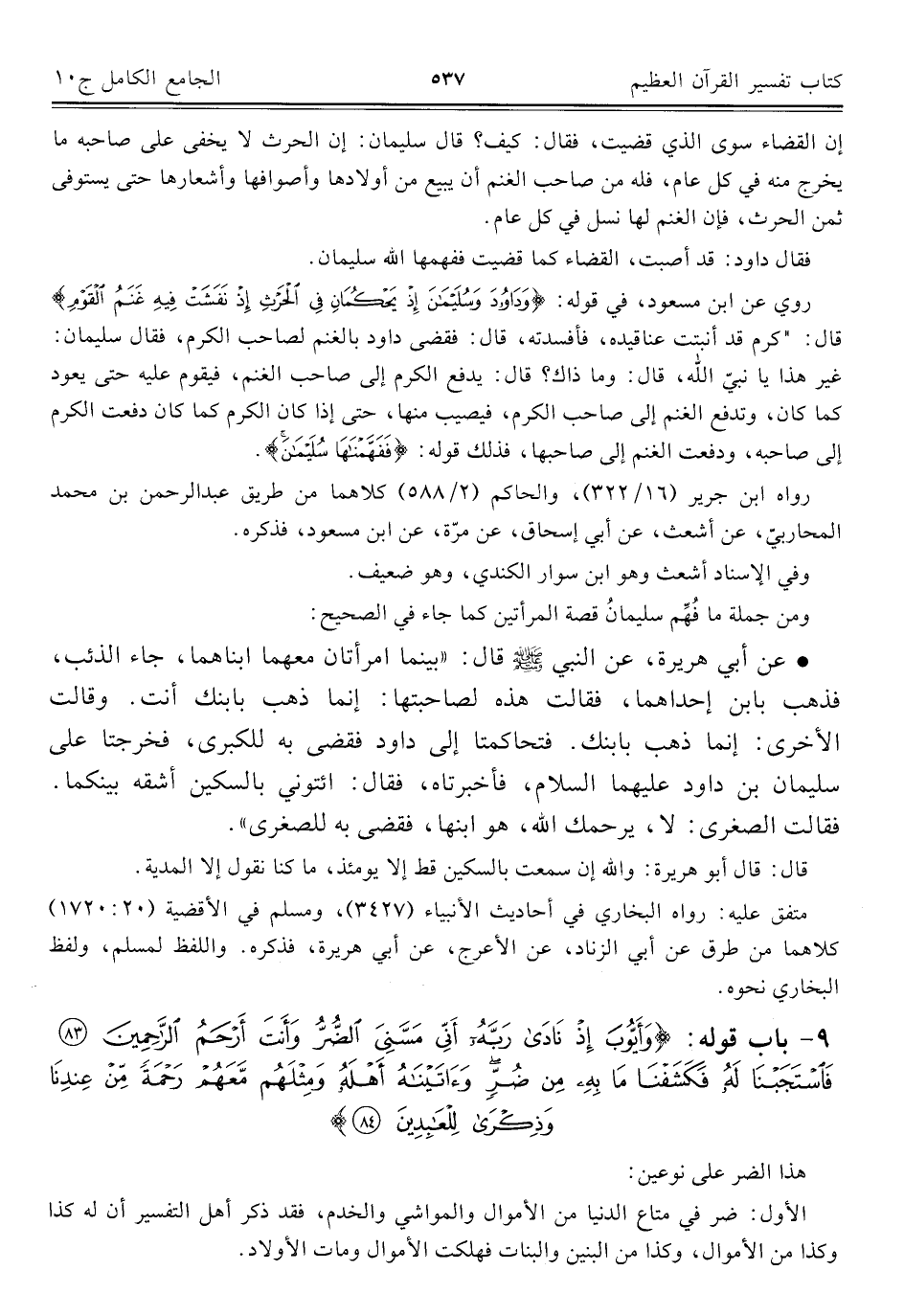 روي عن ابن مسعود، في قوله: {وَدَاوُودَ وَسُلَيْمَانَ إِذْ يَحْكُمَانِ فِي الْحَرْثِ إِذْ نَفَشَتْ فِيهِ غَنَمُ الْقَوْمِ} قال: "كرم قد أنبتت عناقيده، فأفسدته، قال: فقضى داود بالغنم لصاحب الكرم، فقال سليمان: غير هذا يا نبيّ الله، قال: وما ذاك؟ قال: يدفع الكرم إلى صاحب الغنم، فيقوم عليه حتى يعود كما كان، وتدفع الغنم إلى صاحب الكرم، فيصيب منها، حتى إذا كان الكرم كما كان دفعت الكرم إلى صاحبه، ودفعت الغنم إلى صاحبها، فذلك قوله: {فَفَهَّمْنَاهَا سُلَيْمَانَ}.