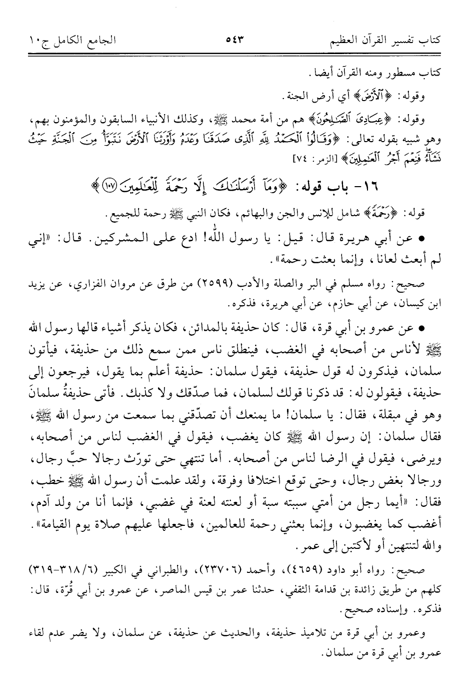 ١٦ - باب قوله: {وَمَا أَرْسَلْنَاكَ إِلَّا رَحْمَةً لِلْعَالَمِينَ (١٠٧)}