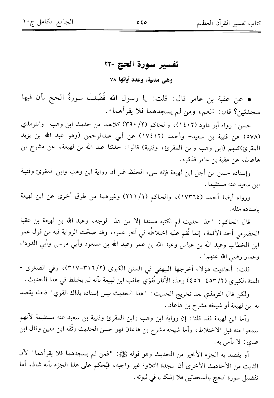 • عن عقبة بن عامر قال: قلت: يا رسول الله فُضّلتْ سورةُ الحج بأن فيها سجدتين؟ قال: "نعم، ومن لم يسجدهما فلا يقرأهما".