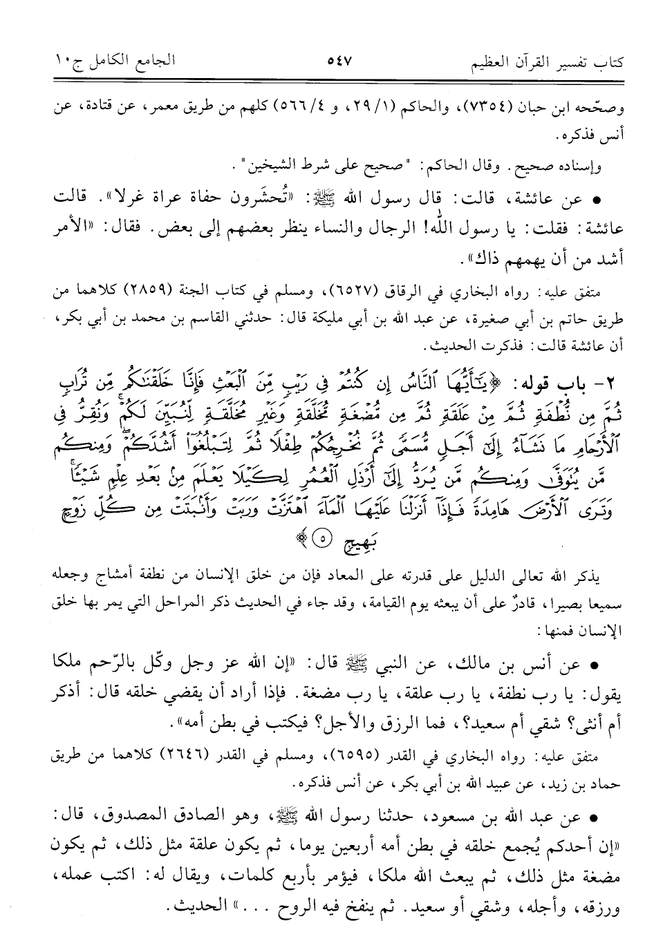 ٢ - باب قوله: {يَاأَيُّهَا النَّاسُ إِنْ كُنْتُمْ فِي رَيْبٍ مِنَ الْبَعْثِ فَإِنَّا خَلَقْنَاكُمْ مِنْ تُرَابٍ ثُمَّ مِنْ نُطْفَةٍ ثُمَّ مِنْ عَلَقَةٍ ثُمَّ مِنْ مُضْغَةٍ مُخَلَّقَةٍ وَغَيْرِ مُخَلَّقَةٍ لِنُبَيِّنَ لَكُمْ وَنُقِرُّ فِي الْأَرْحَامِ مَا نَشَاءُ إِلَى أَجَلٍ مُسَمًّى ثُمَّ نُخْرِجُكُمْ طِفْلًا ثُمَّ لِتَبْلُغُوا أَشُدَّكُمْ وَمِنْكُمْ مَنْ يُتَوَفَّى وَمِنْكُمْ مَنْ يُرَدُّ إِلَى أَرْذَلِ الْعُمُرِ لِكَيْلَا يَعْلَمَ مِنْ بَعْدِ عِلْمٍ شَيْئًا وَتَرَى الْأَرْضَ هَامِدَةً فَإِذَا أَنْزَلْنَا عَلَيْهَا الْمَاءَ اهْتَزَّتْ وَرَبَتْ وَأَنْبَتَتْ مِنْ كُلِّ زَوْجٍ بَهِيجٍ (٥)}