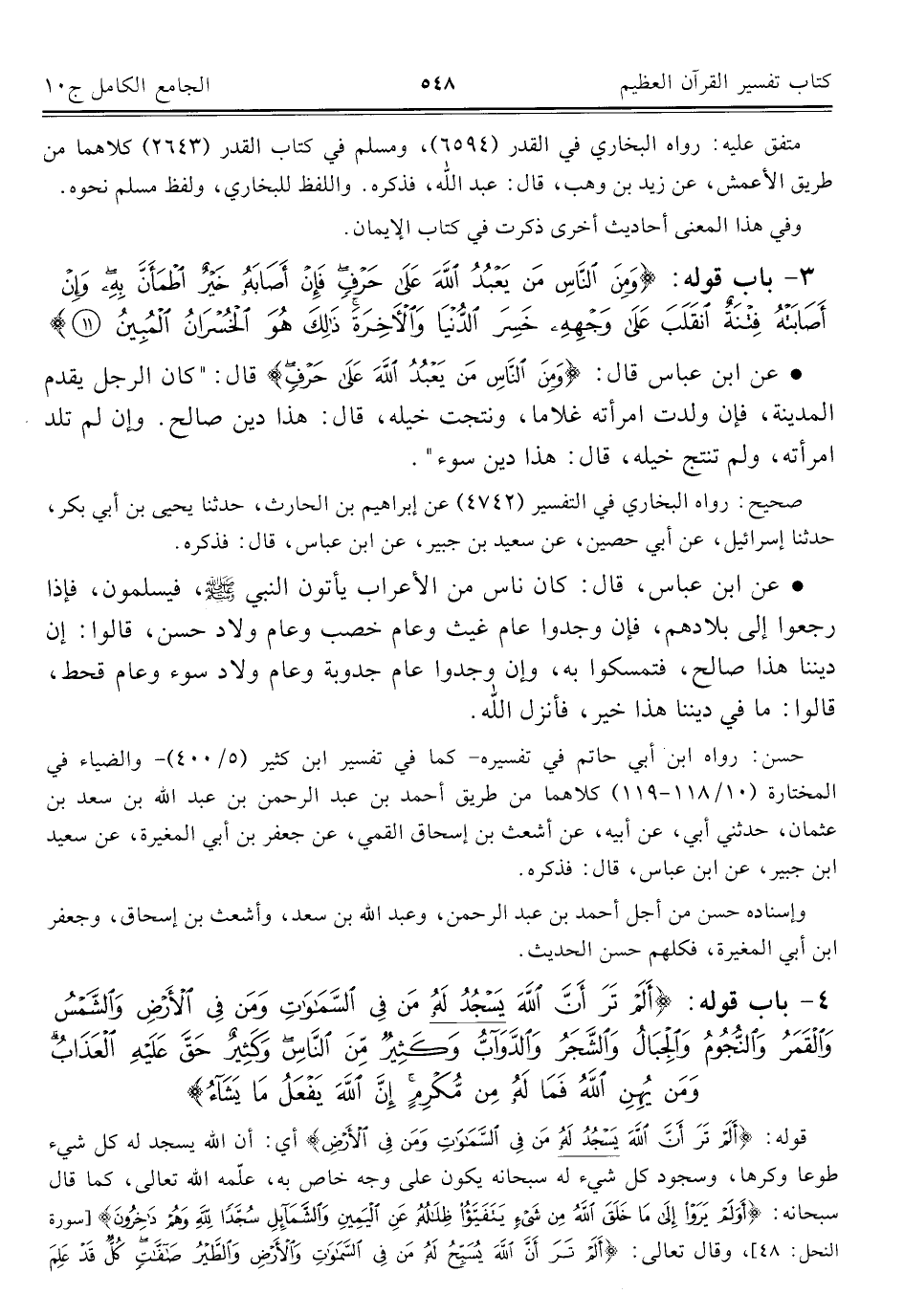 ٣ - باب قوله: {وَمِنَ النَّاسِ مَنْ يَعْبُدُ اللَّهَ عَلَى حَرْفٍ فَإِنْ أَصَابَهُ خَيْرٌ اطْمَأَنَّ بِهِ وَإِنْ أَصَابَتْهُ فِتْنَةٌ انْقَلَبَ عَلَى وَجْهِهِ خَسِرَ الدُّنْيَا وَالْآخِرَةَ ذَلِكَ هُوَ الْخُسْرَانُ الْمُبِينُ (١١)}