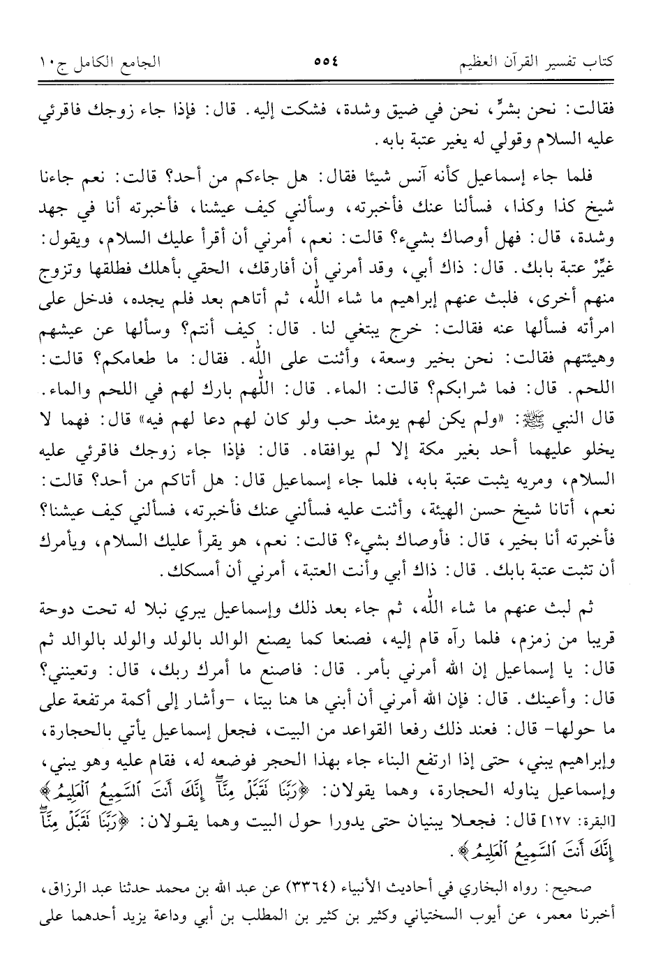 ثم لبث عنهم ما شاء الله، ثم جاء بعد ذلك وإسماعيل يبري نبلا له تحت دوحة قريبا من زمزم، فلما رآه قام إليه، فصنعا كما يصنع الوالد بالولد والولد بالوالد ثم قال: يا إسماعيل إن الله أمرني بأمر. قال: فاصنع ما أمرك ربك، قال: وتعينني؟ قال: وأعينك. قال: فإن الله أمرني أن أبني ها هنا بيتا، - وأشار إلى أكمة مرتفعة على ما حولها - قال: فعند ذلك رفعا القواعد من البيت، فجعل إسماعيل يأتي بالحجارة، وإبراهيم يبني، حتى إذا ارتفع البناء جاء بهذا الحجر فوضعه له، فقام عليه وهو يبني، وإسماعيل يناوله الحجارة، وهما يقولان: {رَبَّنَا تَقَبَّلْ مِنَّا إِنَّكَ أَنْتَ السَّمِيعُ الْعَلِيمُ} [البقرة: ١٢٧] قال: فجعلا يبنيان حتى يدورا حول البيت وهما يقولان: {رَبَّنَا تَقَبَّلْ مِنَّا إِنَّكَ أَنْتَ السَّمِيعُ الْعَلِيمُ}.