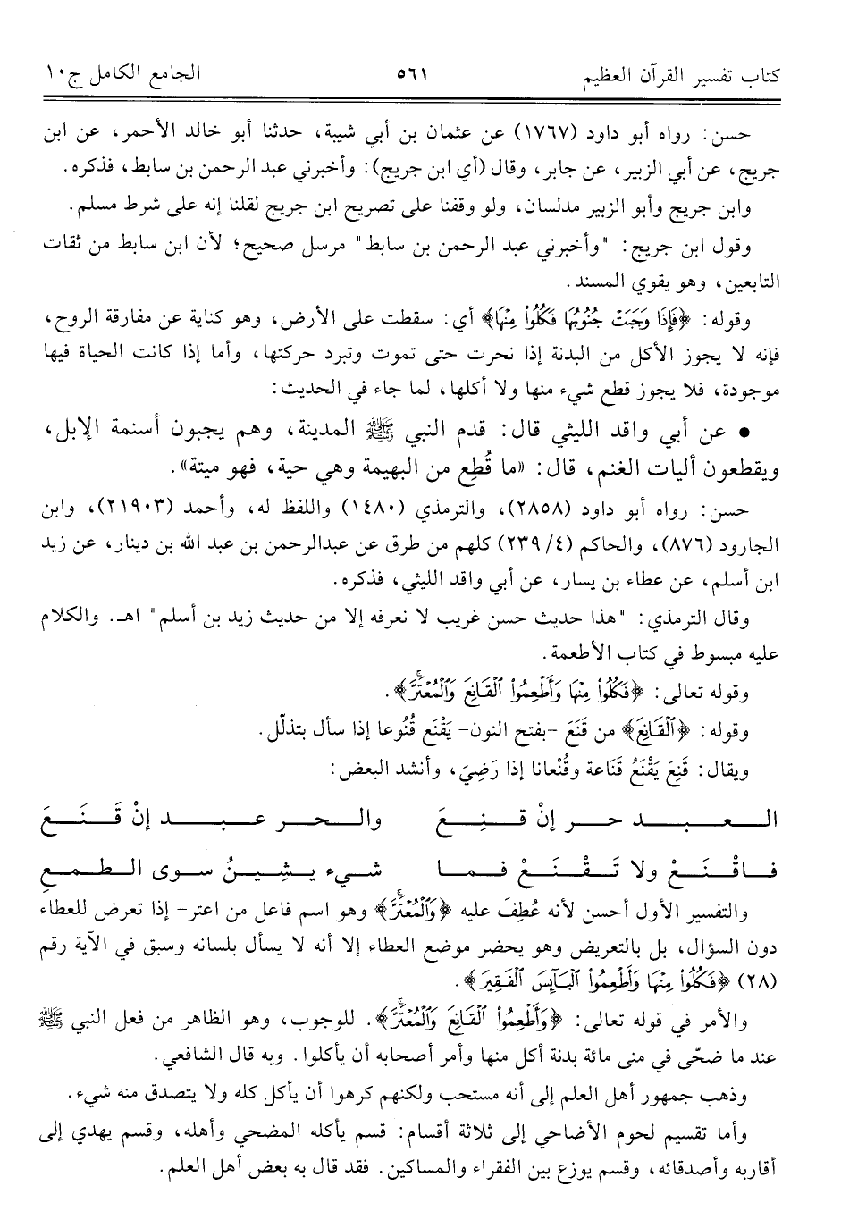 والتفسير الأول أحسن لأنه عُطِفَ عليه {وَالْمُعْتَرَّ} وهو اسم فاعل من اعتر - إذا تعرض للعطاء دون السؤال، بل بالتعريض وهو يحضر موضع العطاء إلا أنه لا يسأل بلسانه وسبق في الآية رقم (٢٨)) {فَكُلُوا مِنْهَا وَأَطْعِمُوا الْبَائِسَ الْفَقِيرَ}.