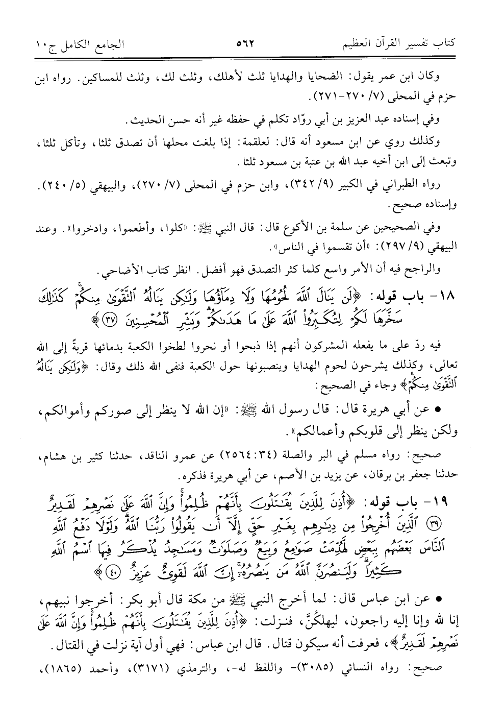 ١٨ - باب قوله: {لَنْ يَنَالَ اللَّهَ لُحُومُهَا وَلَا دِمَاؤُهَا وَلَكِنْ يَنَالُهُ التَّقْوَى مِنْكُمْ كَذَلِكَ سَخَّرَهَا لَكُمْ لِتُكَبِّرُوا اللَّهَ عَلَى مَا هَدَاكُمْ وَبَشِّرِ الْمُحْسِنِينَ (٣٧)}