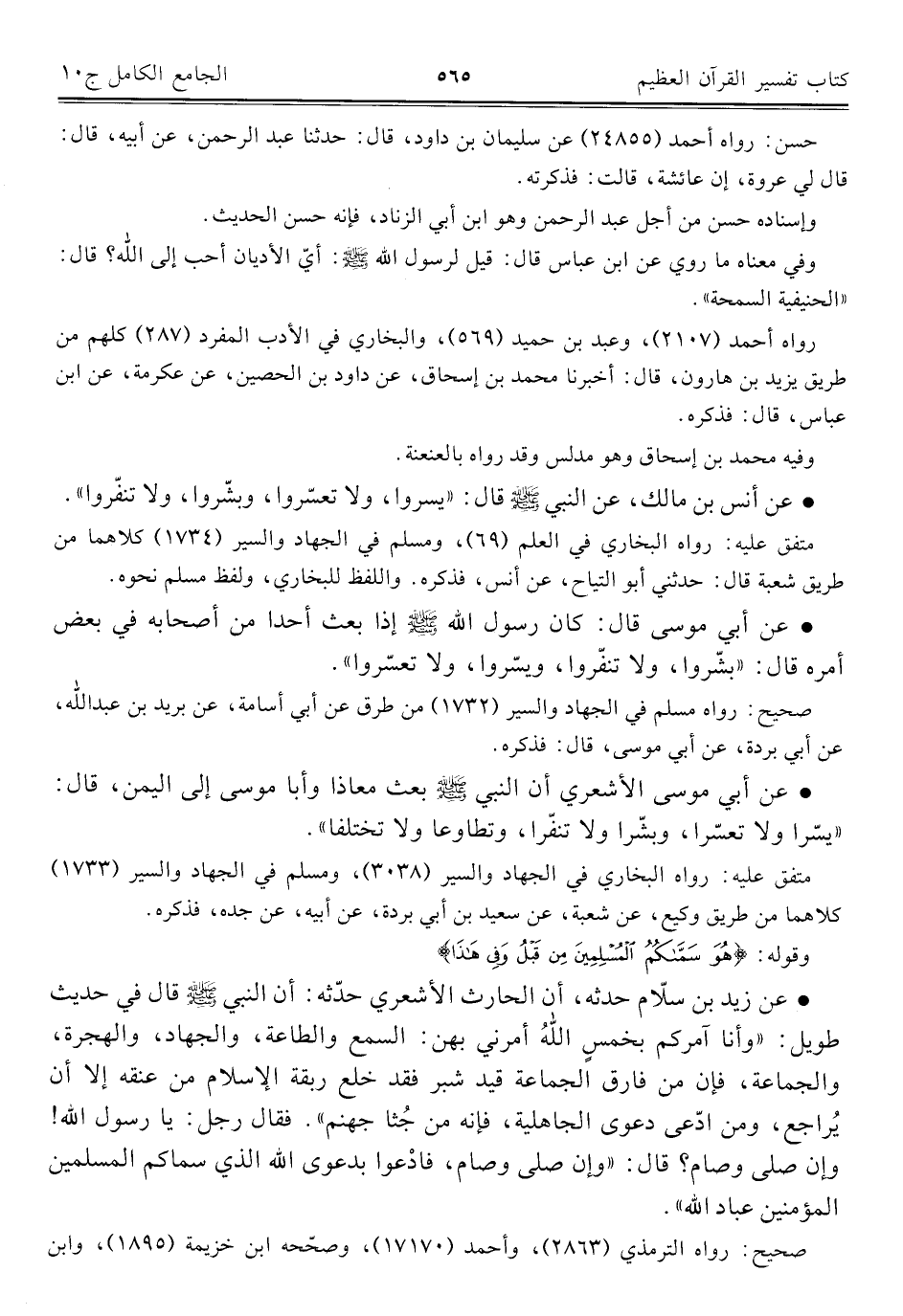 • عن أبي موسى قال: كان رسول الله - صلى الله عليه وسلم - إذا بعث أحدا من أصحابه في بعض أمره قال: "بشّروا، ولا تنفّروا، ويسّروا، ولا تعسّروا".