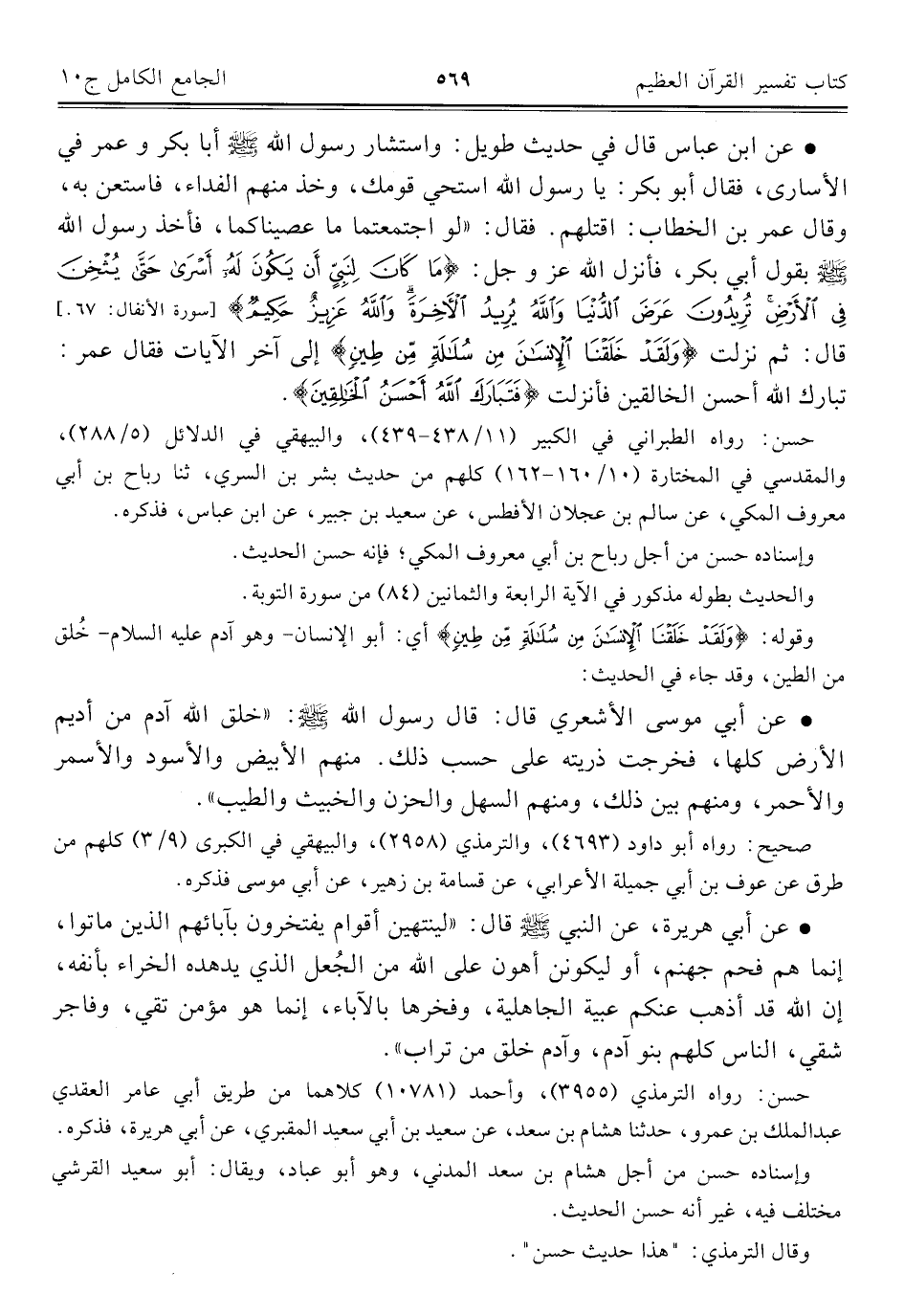 • عن ابن عباس قال في حديث طويل: واستشار رسول الله - صلى الله عليه وسلم - أبا بكر وعمر في الأسارى، فقال أبو بكر: يا رسول الله استحي قومك، وخذ منهم الفداء، فاستعن به، وقال عمر بن الخطاب: اقتلهم. فقال: "لو اجتمعتما ما عصيناكما، فأخذ رسول الله - صلى الله عليه وسلم - بقول أبي بكر، فأنزل الله عز وجل: {مَا كَانَ لِنَبِيٍّ أَنْ يَكُونَ لَهُ أَسْرَى حَتَّى يُثْخِنَ فِي الْأَرْضِ تُرِيدُونَ عَرَضَ الدُّنْيَا وَاللَّهُ يُرِيدُ الْآخِرَةَ وَاللَّهُ عَزِيزٌ حَكِيمٌ} [سورة الأنفال: ٦٧]. قال: ثم نزلت {وَلَقَدْ خَلَقْنَا الْإِنْسَانَ مِنْ سُلَالَةٍ مِنْ طِينٍ} إلى آخر الآيات فقال عمر: تبارك الله أحسن الخالقين فأنزلت {فَتَبَارَكَ اللَّهُ أَحْسَنُ الْخَالِقِينَ}.