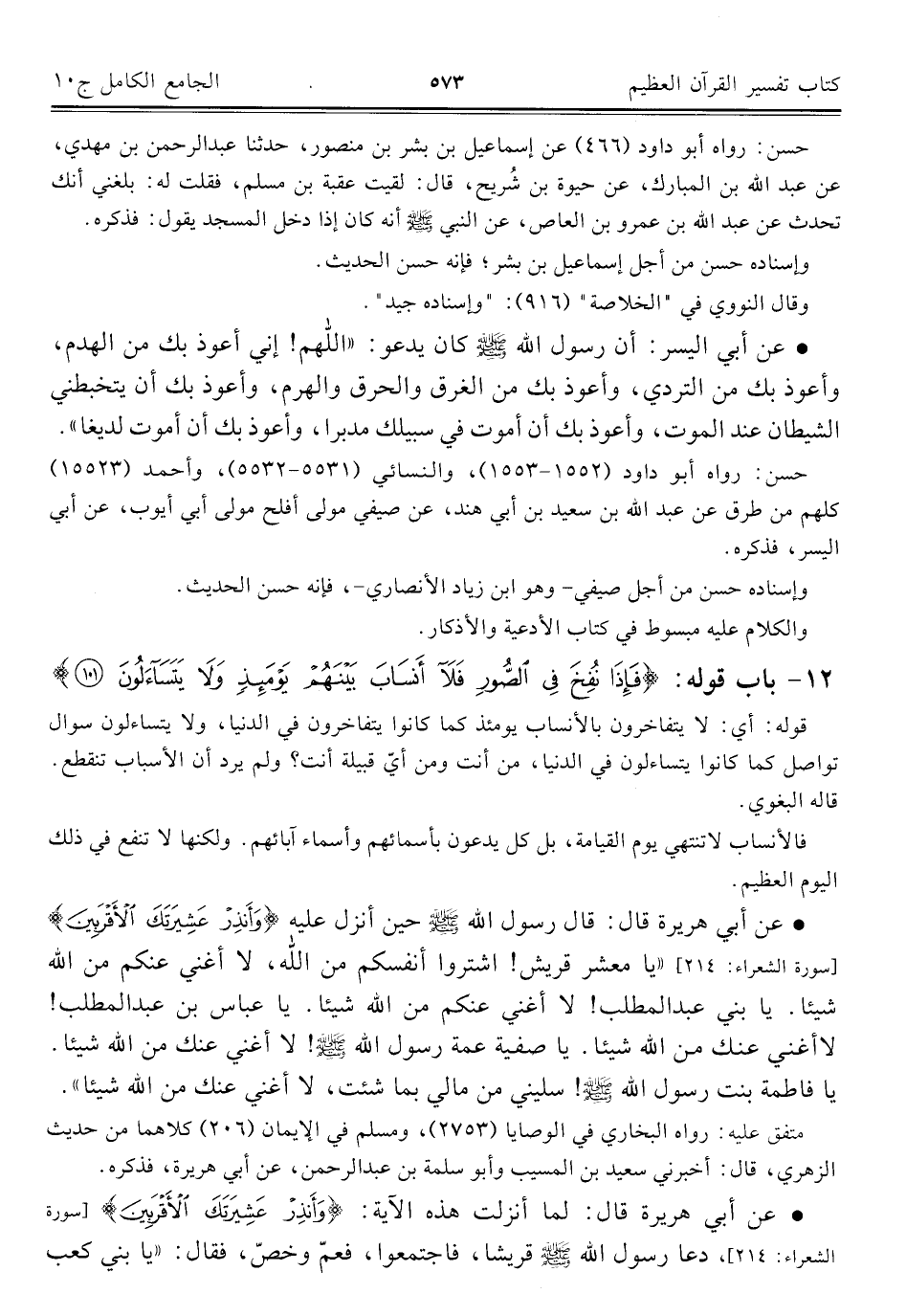• عن أبي هريرة قال: قال رسول الله - صلى الله عليه وسلم - حين أنزل عليه {وَأَنْذِرْ عَشِيرَتَكَ الْأَقْرَبِينَ} [سورة الشعراء: ٢١٤] "يا معشر قريش! اشتروا أنفسكم من الله، لا أغني عنكم من الله شيئا. يا بني عبد المطلب! لا أغني عنكم من الله شيئا. يا عباس بن عبد المطلب! لا أغني عنك من الله شيئا. يا صفية عمة رسول الله - صلى الله عليه وسلم -! لا أغني عنك من الله شيئا. يا فاطمة بنت رسول الله - صلى الله عليه وسلم -! سليني من مالي بما شئت، لا أغني عنك من الله شيئا".