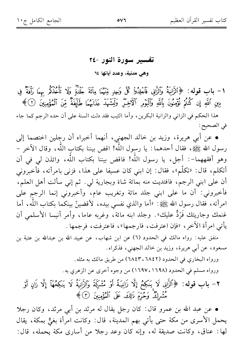 • عن أبي هريرة، وزيد بن خالد الجهني، أنهما أخبراه أن رجلين اختصما إلى رسول الله - صلى الله عليه وسلم -، فقال أحدهما: يا رسول الله! اقض بيننا بكتاب الله، وقال الآخر - وهو أفقههما -: أجل، يا رسول الله! فاقض بيننا بكتاب الله، وائذن لي في أن أتكلم، قال: "تكلّم"، فقال: إن ابني كان عسيفا على هذا، فزنى بامرأته، فأخبروني أن على ابني الرجم، فافتديت منه بمائة شاة وبجارية لي. ثم إني سألت أهل العلم، فأخبروني: أن ما على ابني جلد مائة وتغريب عام، وأخبروني إنما الرجم على امرأته، فقال رسول الله - صلى الله عليه وسلم -: "أما والذي نفسي بيده، لأقضينّ بينكما بكتاب الله، أما غنمك وجاريتك فَرَدٌّ عليك". وجلد ابنه مائة، وغربه عاما، وأمر أنيسا الأسلمي أن يأتي امرأة الآخر، "فإن اعترفت، فارجمها"، فاعترفت، فرجمها.