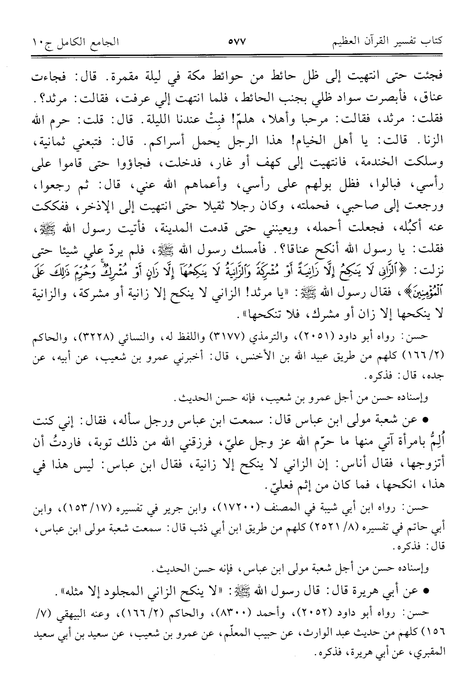 فجئت حتى انتهيت إلى ظل حائط من حوائط مكة في ليلة مقمرة. قال: فجاءت عناق، فأبصرت سواد ظلي بجنب الحائط، فلما انتهت إلي عرفت، فقالت: مرثد؟ . فقلت: مرثد، فقالت: مرحبا وأهلا، هلمّ! فبِتْ عندنا الليلة. قال: قلت: حرم الله الزنا. قالت: يا أهل الخيام! هذا الرجل يحمل أسراكم. قال: فتبعني ثمانية، وسلكت الخندمة، فانتهيت إلى كهف أو غار، فدخلت، فجاؤوا حتى قاموا على رأسي، فبالوا، فظل بولهم على رأسي، وأعماهم الله عني، قال: ثم رجعوا، ورجعت إلى صاحبي، فحملته، وكان رجلا ثقيلا حتى انتهيت إلى الإذخر، ففككت عنه أكبُله، فجعلت أحمله، ويعينني حتى قدمت المدينة، فأتيت رسول الله - صلى الله عليه وسلم -، فقلت: يا رسول الله أنكح عناقا؟ . فأمسك رسول الله - صلى الله عليه وسلم -، فلم يردّ علي شيئا حتى نزلت: {الزَّانِي لَا يَنْكِحُ إِلَّا زَانِيَةً أَوْ مُشْرِكَةً وَالزَّانِيَةُ لَا يَنْكِحُهَا إِلَّا زَانٍ أَوْ مُشْرِكٌ وَحُرِّمَ ذَلِكَ عَلَى الْمُؤْمِنِينَ}، فقال رسول الله - صلى الله عليه وسلم -: "يا مرثد! الزاني لا ينكح إلا زانية أو مشركة، والزانية لا ينكحها إلا زان أو مشرك، فلا تنكحها".