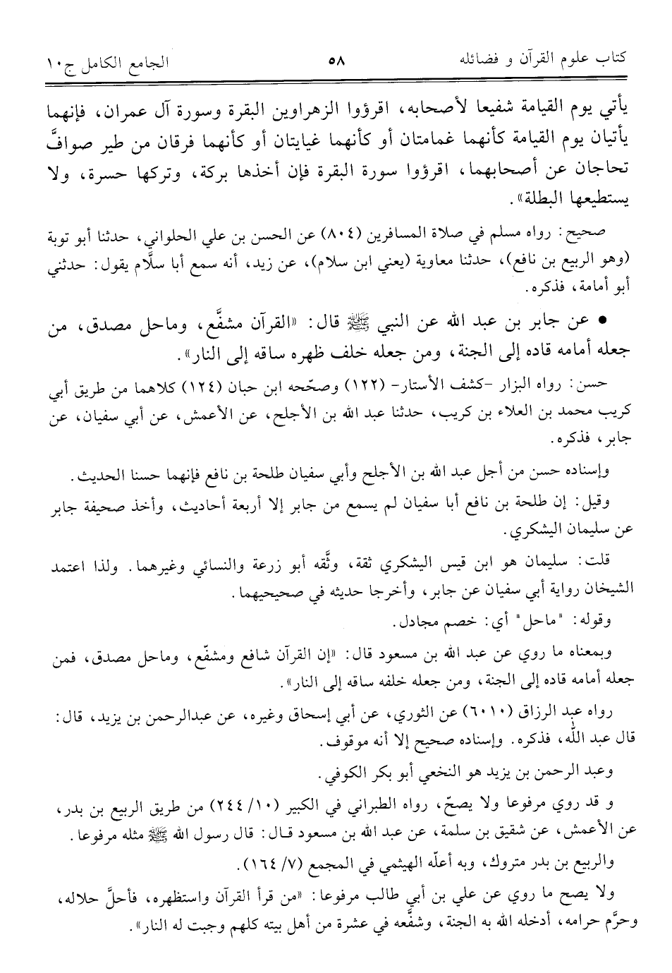 • عن جابر بن عبد اللَّه عن النبي -صلى اللَّه عليه وسلم- قال: "القرآن مشفَّع، وماحل مصدق، من جعله أمامه قاده إلى الجنة، ومن جعله خلف ظهره ساقه إلى النار".