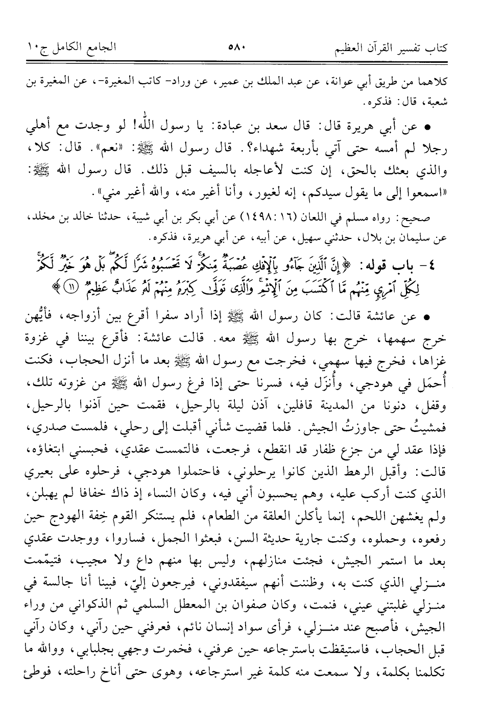 ٤ - باب قوله: {إِنَّ الَّذِينَ جَاءُوا بِالْإِفْكِ عُصْبَةٌ مِنْكُمْ لَا تَحْسَبُوهُ شَرًّا لَكُمْ بَلْ هُوَ خَيْرٌ لَكُمْ لِكُلِّ امْرِئٍ مِنْهُمْ مَا اكْتَسَبَ مِنَ الْإِثْمِ وَالَّذِي تَوَلَّى كِبْرَهُ مِنْهُمْ لَهُ عَذَابٌ عَظِيمٌ (١١)}