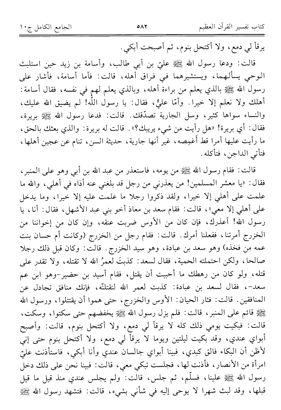 قالت: فقام رسول الله - صلى الله عليه وسلم - من يومه، فاستعذر من عبد الله بن أبي وهو على المنبر، فقال: "يا معشر المسلمين! من يعذرني من رجل قد بلغني عنه أذاه في أهلي، والله ما علمت على أهلي إلا خيرا، ولقد ذكروا رجلا ما علمت عليه إلا خيرا، وما يدخل على أهلي إلا معي"، قالت: فقام سعد بن معاذ أخو بني عبد الأشهل، فقال: أنا، يا رسول الله! أعذرك، فإن كان من الأوس ضربت عنقه، وإن كان من إخواننا من الخزرج أمرتنا، ففعلنا أمرك. قالت: فقام رجل من الخزرج (وكانت أم حسان بنت عمه من فخذه) وهو سعد بن عبادة، وهو سيد الخزرج. قالت: وكان قبل ذلك رجلا صالحا، ولكن احتملته الحمية، فقال لسعد: كذبتَ لعمرُ الله لا تقتله، ولا تقدر على قتله، ولو كان من رهطك ما أحببت أن يقتل، فقام أسيد بن حضير - وهو ابن عم سعد -، فقال لسعد بن عبادة: كذبت لعمر الله لنقتلنّه، فإنك منافق تجادل عن المنافقين. قالت: فثار الحيان: الأوس والخزرج، حتى هموا أن يقتتلوا، ورسول الله - صلى الله عليه وسلم - قائم على المنبر، قالت: فلم يزل رسول الله - صلى الله عليه وسلم - يخفضهم حتى سكتوا، وسكت، قالت: فبكيت يومي ذلك كله لا يرقأ لي دمع، ولا أكتحل بنوم، قالت: وأصبح أبواي عندي، وقد بكيت ليلتين ويوما لا يرقأ لي دمع، ولا أكتحل بنوم حتى إني لأظن أن البكاء فالق كبدي، فبينا أبواي جالسان عندي وأنا أبكي، فاستأذنت عليّ امرأة من الأنصار، فأذنت لها، فجلست تبكي معي، قالت: فبينا نحن على ذلك دخل رسول الله - صلى الله عليه وسلم - علينا، فسلّم، ثم جلس، قالت: ولم يجلس عندي منذ قيل ما قيل قبلها، وقد لبث شهرا لا يوحى إليه في شأني بشيء، قالت: فتشهد رسول الله - صلى الله عليه وسلم -