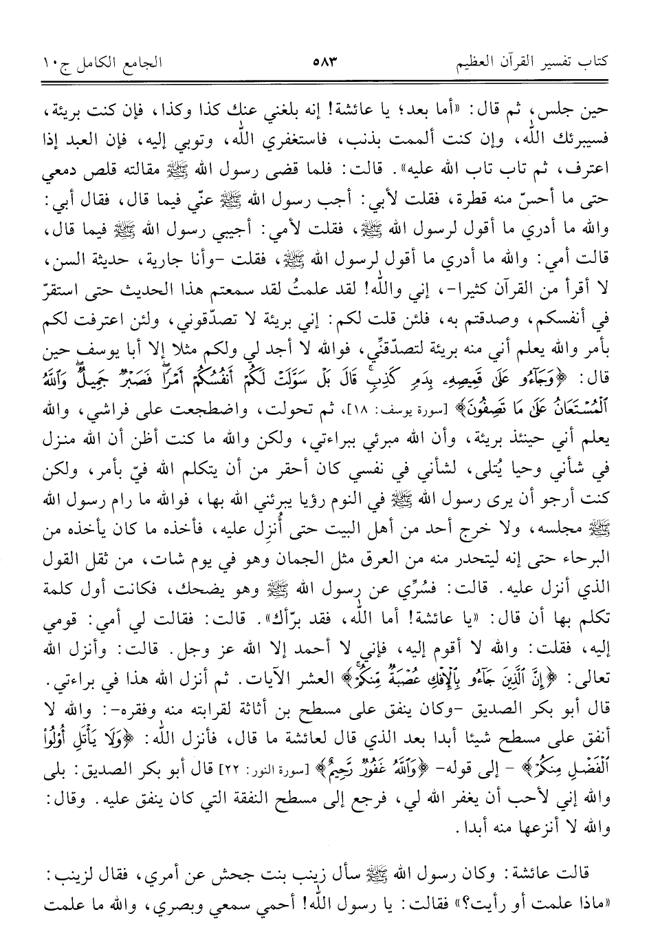 حين جلس، ثم قال: "أما بعد؛ يا عائشة! إنه بلغني عنك كذا وكذا، فإن كنت بريئة، فسيبرئك الله، وإن كنت ألممت بذنب، فاستغفري الله، وتوبي إليه، فإن العبد إذا اعترف، ثم تاب تاب الله عليه". قالت: فلما قضى رسول الله - صلى الله عليه وسلم - مقالته قلص دمعي حتى ما أحسّ منه قطرة، فقلت لأبي: أجب رسول الله - صلى الله عليه وسلم - عنّي فيما قال، فقال أبي: والله ما أدري ما أقول لرسول الله - صلى الله عليه وسلم -، فقلت لأمي: أجيبي رسول الله - صلى الله عليه وسلم - فيما قال، قالت أمي: والله ما أدري ما أقول لرسول الله - صلى الله عليه وسلم -، فقلت - وأنا جارية، حديثة السن، لا أقرأ من القرآن كثيرا -، إني والله! لقد علمتُ لقد سمعتم هذا الحديث حتى استقرّ في أنفسكم، وصدقتم به، فلئن قلت لكم: إني بريئة لا تصدّقوني، ولئن اعترفت لكم بأمر والله يعلم أني منه بريئة لتصدّقنِّي، فوالله لا أجد لي ولكم مثلا إلا أبا يوسف حين قال: {وَجَاءُوا عَلَى قَمِيصِهِ بِدَمٍ كَذِبٍ قَالَ بَلْ سَوَّلَتْ لَكُمْ أَنْفُسُكُمْ أَمْرًا فَصَبْرٌ جَمِيلٌ وَاللَّهُ الْمُسْتَعَانُ عَلَى مَا تَصِفُونَ} [سورة يوسف: ١٨]، ثم تحولت، واضطجعت على فراشي، والله يعلم أني حينئذ بريئة، وأن الله مبرئي ببراءتي، ولكن والله ما كنت أظن أن الله منزل في شأني وحيا يُتلى، لشأني في نفسي كان أحقر من أن يتكلم الله فيّ بأمر، ولكن كنت أرجو أن يرى رسول الله - صلى الله عليه وسلم - في النوم رؤيا يبرئني الله بها، فوالله ما رام رسول الله - صلى الله عليه وسلم - مجلسه، ولا خرج أحد من أهل البيت حتى أُنزِل عليه، فأخذه ما كان يأخذه من البرحاء حتى إنه ليتحدر منه من العرق مثل الجمان وهو في يوم شات، من ثقل القول الذي أنزل عليه. قالت: فسُرِّي عن رسول الله - صلى الله عليه وسلم - وهو يضحك، فكانت أول كلمة تكلم بها أن قال: "يا عائشة! أما الله، فقد برّأك". قالت: فقالت لي أمي: قومي إليه، فقلت: والله لا أقوم إليه، فإني لا أحمد إلا الله عز وجل. قالت: وأنزل الله تعالى: {إِنَّ الَّذِينَ جَاءُوا بِالْإِفْكِ عُصْبَةٌ مِنْكُمْ} العشر الآيات. ثم أنزل الله هذا في براءتي. قال أبو بكر الصديق - وكان ينفق على مسطح بن أثاثة لقرابته منه وفقره -: والله لا أنفق على مسطح شيئا أبدا بعد الذي قال لعائشة ما قال، فأنزل الله: {وَلَا يَأْتَلِ أُولُو الْفَضْلِ مِنْكُمْ} - إلى قوله - {وَاللَّهُ غَفُورٌ رَحِيمٌ} [سورة النور: ٢٢] قال أبو بكر الصديق: بلى والله إني لأحب أن يغفر الله لي، فرجع إلى مسطح النفقة التي كان ينفق عليه. وقال: والله لا أنزعها منه أبدا.