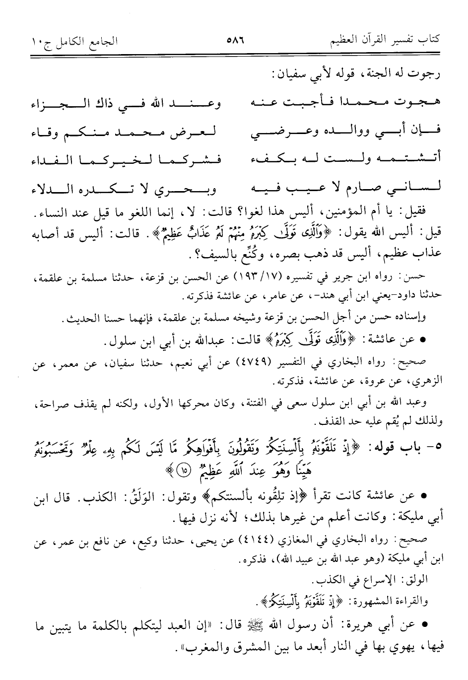 فقيل: يا أم المؤمنين، أليس هذا لغوا؟ قالت: لا، إنما اللغو ما قيل عند النساء. قيل: أليس الله يقول: {وَالَّذِي تَوَلَّى كِبْرَهُ مِنْهُمْ لَهُ عَذَابٌ عَظِيمٌ}. قالت: أليس قد أصابه عذاب عظيم، أليس قد ذهب بصره، وكُنِّع بالسيف؟ .