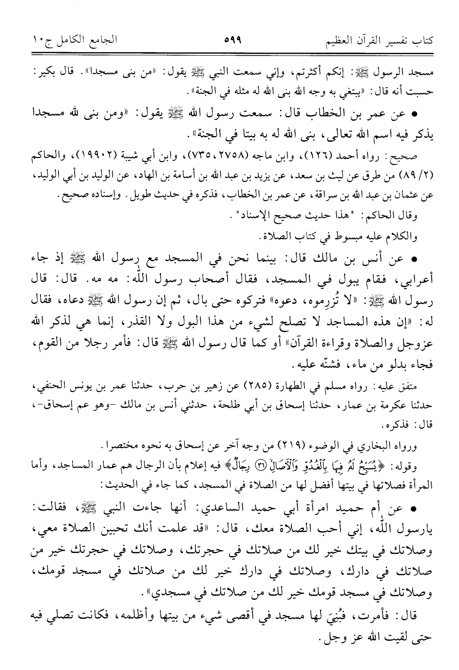 مسجد الرسول - صلى الله عليه وسلم -: إنكم أكثرتم، وإني سمعت النبي - صلى الله عليه وسلم - يقول: "من بنى مسجدا". قال بكير: حسبت أنه قال: "يبتغي به وجه الله بنى الله له مثله في الجنة".