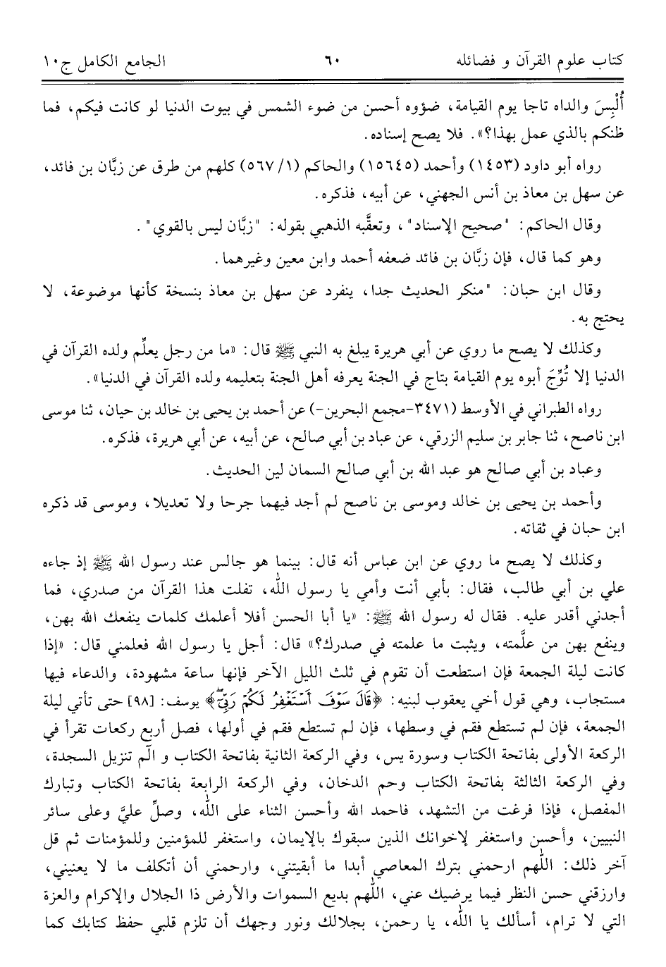 وكذلك لا يصح ما روي عن ابن عباس أنه قال: بينما هو جالس عند رسول اللَّه -صلى اللَّه عليه وسلم- إذ جاءه علي بن أبي طالب، فقال: بأبي أنت وأمي يا رسول اللَّه، تفلت هذا القرآن من صدري، فما أجدني أقدر عليه. فقال له رسول اللَّه -صلى اللَّه عليه وسلم-: "يا أبا الحسن أفلا أعلمك كلمات ينفعك اللَّه بهن، وينفع بهن من علَّمته، ويثبت ما علمته في صدرك؟ " قال: أجل يا رسول اللَّه فعلمني قال: "إذا كانت ليلة الجمعة فإن استطعت أن تقوم في ثلث الليل الآخر فإنها ساعة مشهودة، والدعاء فيها مستجاب، وهي قول أخي يعقوب لبنيه: {قَالَ سَوْفَ أَسْتَغْفِرُ لَكُمْ رَبِّي} [يوسف: ٩٨] حتى تأتي ليلة الجمعة، فإن لم تستطع فقم في وسطها، فإن لم تستطع فقم في أولها، فصل أربع ركعات تقرأ في الركعة الأولى بفاتحة الكتاب وسورة يس، وفي الركعة الثانية بفاتحة الكتاب والم تنزيل السجدة، وفي الركعة الثالثة بفاتحة الكتاب وحم الدخان، وفي الركعة الرابعة بفاتحة الكتاب وتبارك المفصل، فإذا فرغت من التّشهد، فاحمد اللَّه وأحسن الثناء على اللَّه، وصلِّ عليَّ وعلى سائر النبيين، وأحسن واستغفر لاخوانك الذين سبقوك بالايمان، واستغفر للمؤمنين وللمؤمنات ثم قل آخر ذلك: اللَّهم ارحمني بترك المعاصي أبدًا ما أبقيتني، وارحمني أن أتكلف ما لا يعنيني، وارزقني حسن النظر فيما يرضيك عني، اللَّهم بديع السموات والأرض ذا الجلال والإكرام والعزة التي لا ترام، أسألك يا اللَّه، يا رحمن، بجلالك ونور وجهك أن تلزم قلبي حفظ كتابك كما