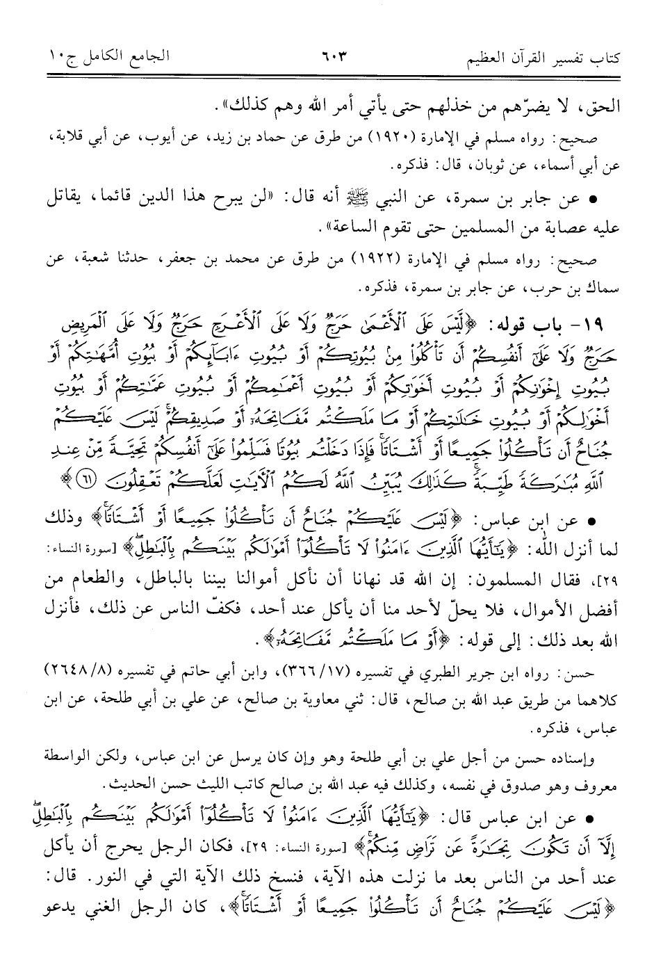 • عن ابن عباس قال: {يَاأَيُّهَا الَّذِينَ آمَنُوا لَا تَأْكُلُوا أَمْوَالَكُمْ بَيْنَكُمْ بِالْبَاطِلِ إِلَّا أَنْ تَكُونَ تِجَارَةً عَنْ تَرَاضٍ مِنْكُمْ} [سورة النساء: ٢٩]، فكان الرجل يحرج أن يأكل عند أحد من الناس بعد ما نزلت هذه الآية، فنسخ ذلك الآية التي في النور. قال: {لَيْسَ عَلَيْكُمْ جُنَاحٌ أَنْ تَأْكُلُوا جَمِيعًا أَوْ أَشْتَاتًا}، كان الرجل الغني يدعو