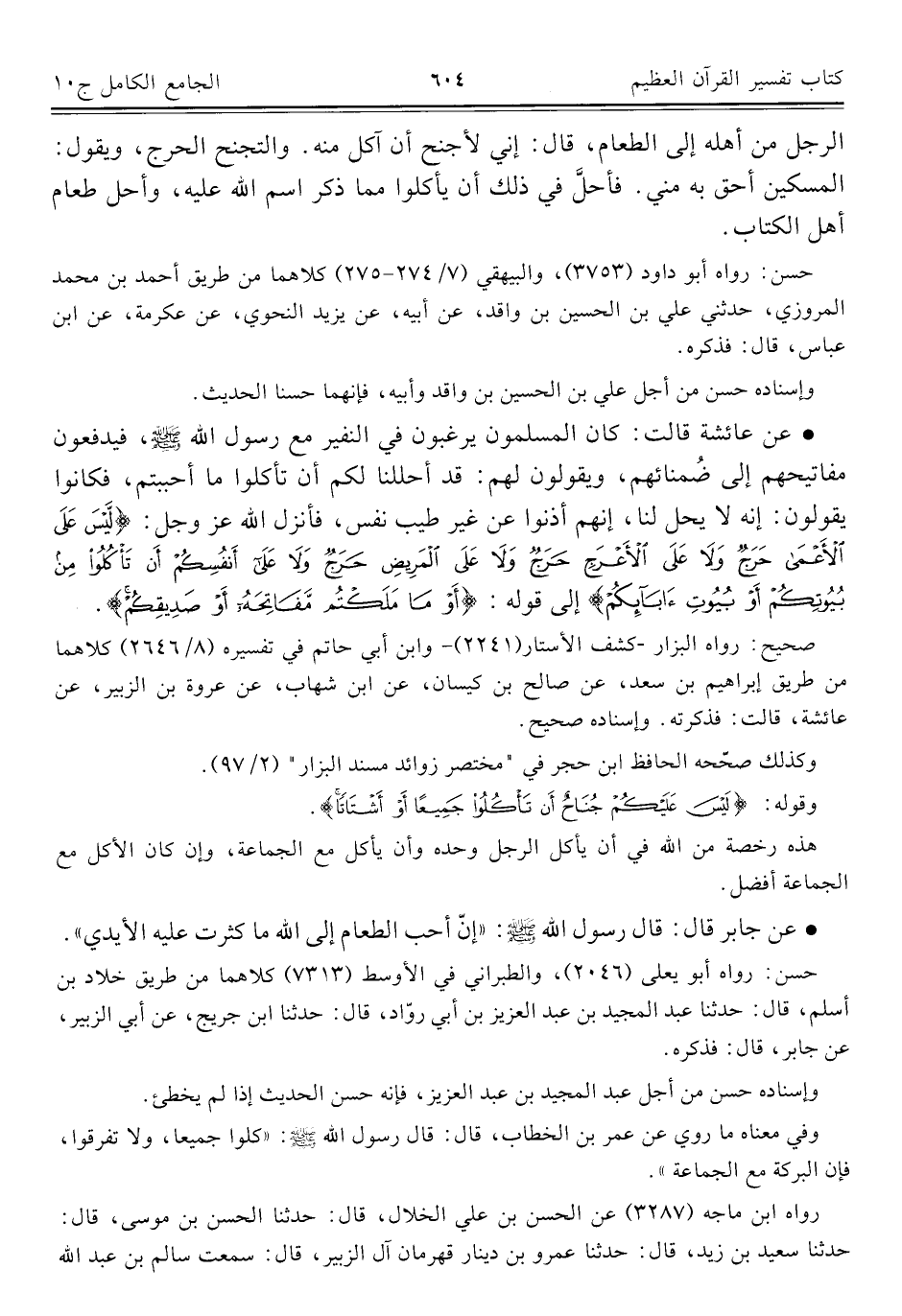 • عن عائشة قالت: كان المسلمون يرغبون في النفير مع رسول الله - صلى الله عليه وسلم -، فيدفعون مفاتيحهم إلى ضُمنائهم، ويقولون لهم: قد أحللنا لكم أن تأكلوا ما أحببتم، فكانوا يقولون: إنه لا يحل لنا، إنهم أذنوا عن غير طيب نفس، فأنزل الله عز وجل: {لَيْسَ عَلَى الْأَعْمَى حَرَجٌ وَلَا عَلَى الْأَعْرَجِ حَرَجٌ وَلَا عَلَى الْمَرِيضِ حَرَجٌ وَلَا عَلَى أَنْفُسِكُمْ أَنْ تَأْكُلُوا مِنْ بُيُوتِكُمْ أَوْ بُيُوتِ آبَائِكُمْ} إلى قوله: {أَوْ مَا مَلَكْتُمْ مَفَاتِحَهُ أَوْ صَدِيقِكُمْ}.