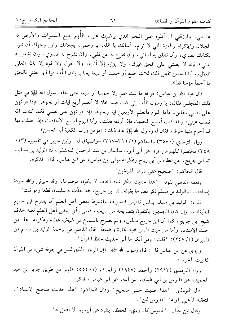 رواه الترمذيّ (٣٥٧٠) والحاكم (١/ ٣١٦ - ٣١٧) -والسياق له- وابن جرير في تفسيره (١٣/ ٣٤٨) مختصرًا كلهم من طرق عن أبي أيوب سليمان بن عبد الرحمن الدمشقي، ثنا الوليد بن مسلم، ثنا ابن جريج، عن عطاء بن أبي رباح وعكرمة مولى ابن عباس، عن ابن عباس، قال: فذكره.