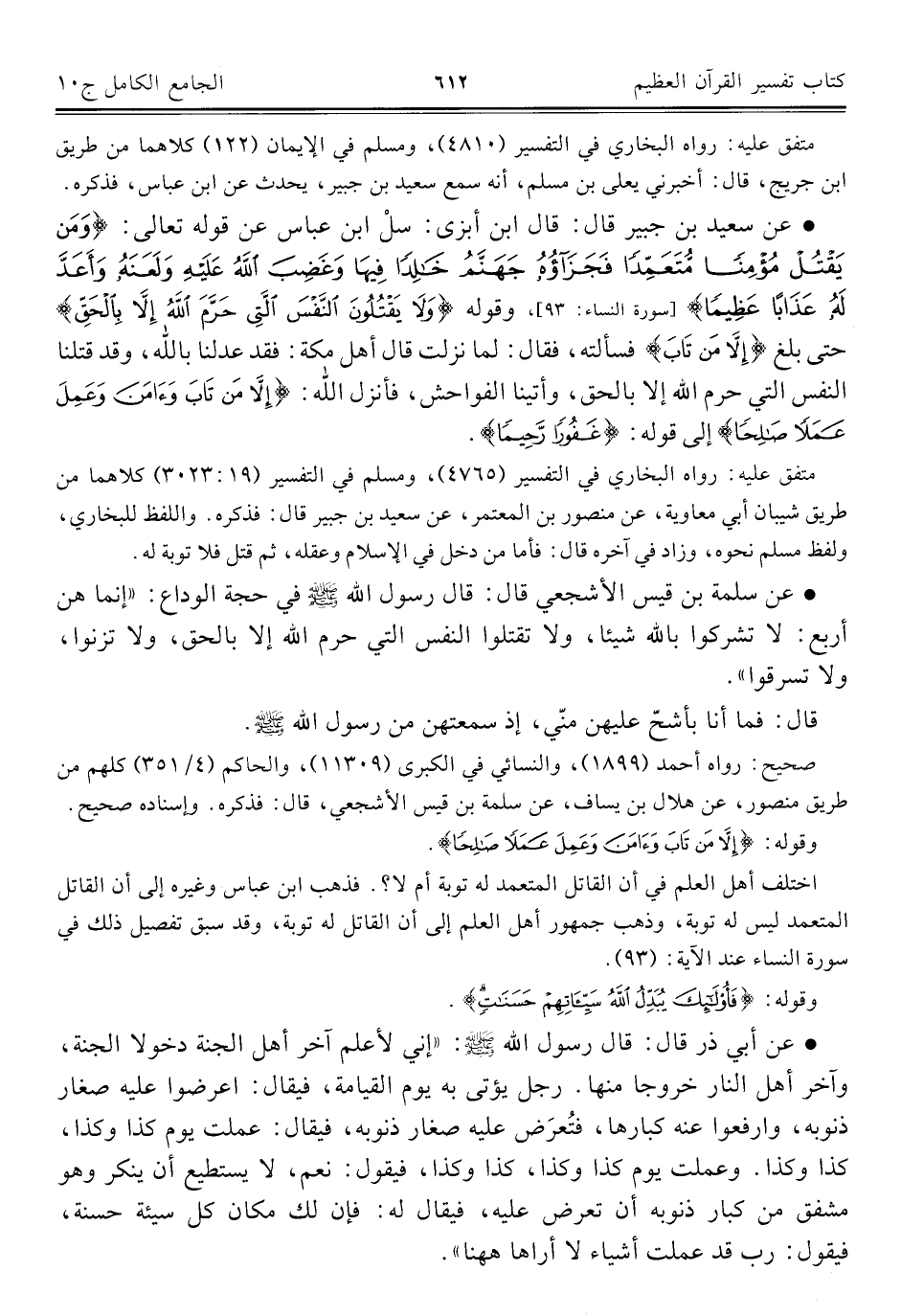• عن سعيد بن جبير قال: قال ابن أبزى: سلْ ابن عباس عن قوله تعالى: {وَمَنْ يَقْتُلْ مُؤْمِنًا مُتَعَمِّدًا فَجَزَاؤُهُ جَهَنَّمُ خَالِدًا فِيهَا وَغَضِبَ اللَّهُ عَلَيْهِ وَلَعَنَهُ وَأَعَدَّ لَهُ عَذَابًا عَظِيمًا} [سورة النساء: ٩٣]، وقوله {وَلَا يَقْتُلُونَ النَّفْسَ الَّتِي حَرَّمَ اللَّهُ إِلَّا بِالْحَقِّ} حتى بلغ {إِلَّا مَنْ تَابَ} فسألته، فقال: لما نزلت قال أهل مكة: فقد عدلنا بالله، وقد قتلنا النفس التي حرم الله إلا بالحق، وأتينا الفواحش، فأنزل الله: {إِلَّا مَنْ تَابَ وَآمَنَ وَعَمِلَ عَمَلًا صَالِحًا} إلى قوله: {غَفُورًا رَحِيمًا}.