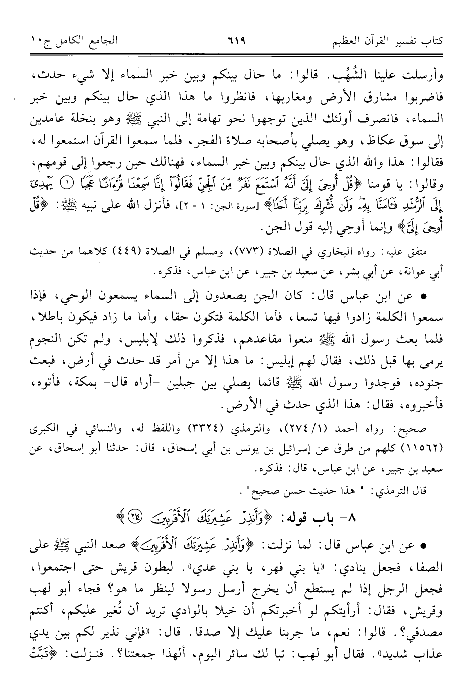 وأرسلت علينا الشُهُب. قالوا: ما حال بينكم وبين خبر السماء إلا شيء حدث، فاضربوا مشارق الأرض ومغاربها، فانظروا ما هذا الذي حال بينكم وبين خبر السماء، فانصرف أولئك الذين توجهوا نحو تهامة إلى النبي - صلى الله عليه وسلم - وهو بنخلة عامدين إلى سوق عكاظ، وهو يصلي بأصحابه صلاة الفجر، فلما سمعوا القرآن استمعوا له، فقالوا: هذا والله الذي حال بينكم وبين خبر السماء، فهنالك حين رجعوا إلى قومهم، وقالوا: يا قومنا {قُلْ أُوحِيَ إِلَيَّ أَنَّهُ اسْتَمَعَ نَفَرٌ مِنَ الْجِنِّ فَقَالُوا إِنَّا سَمِعْنَا قُرْآنًا عَجَبًا (١) يَهْدِي إِلَى الرُّشْدِ فَآمَنَّا بِهِ وَلَنْ نُشْرِكَ بِرَبِّنَا أَحَدً} [سورة الجن: ١ - ٢]، فأنزل الله على نبيه - صلى الله عليه وسلم -: {قُلْ أُوحِيَ إِلَيَّ} وإنما أوحِي إليه قول الجن.