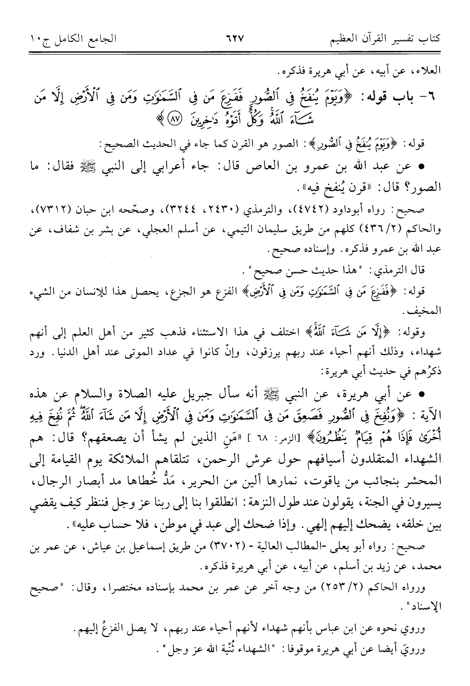 ٦ - باب قوله: {وَيَوْمَ يُنْفَخُ فِي الصُّورِ فَفَزِعَ مَنْ فِي السَّمَاوَاتِ وَمَنْ فِي الْأَرْضِ إِلَّا مَنْ شَاءَ اللَّهُ وَكُلٌّ أَتَوْهُ دَاخِرِينَ (٨٧)}