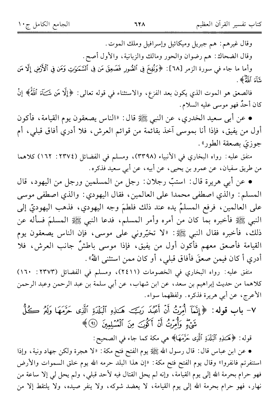 ٧ - باب قوله: {إِنَّمَا أُمِرْتُ أَنْ أَعْبُدَ رَبَّ هَذِهِ الْبَلْدَةِ الَّذِي حَرَّمَهَا وَلَهُ كُلُّ شَيْءٍ وَأُمِرْتُ أَنْ أَكُونَ مِنَ الْمُسْلِمِينَ (٩١)}