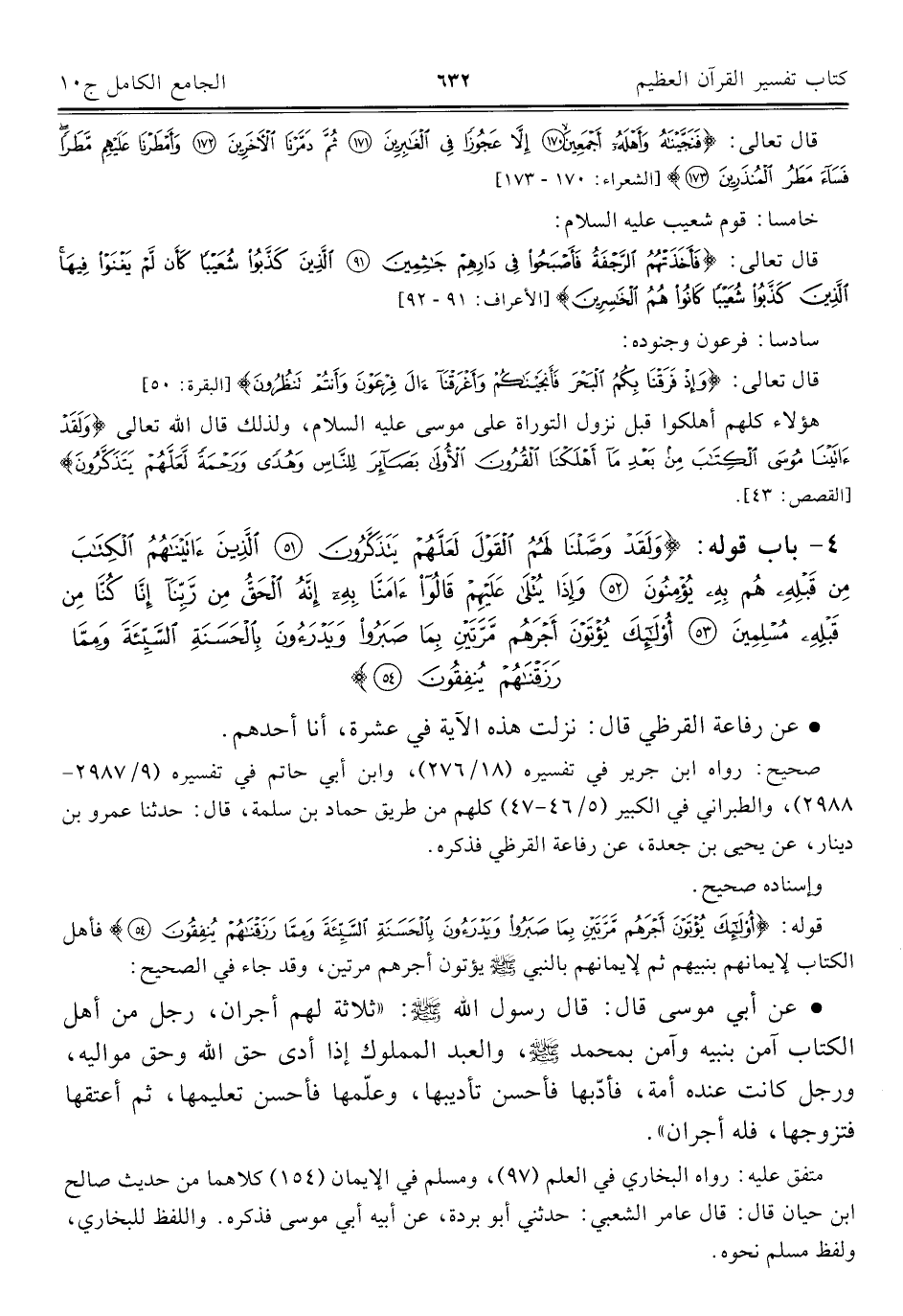 قوله: {أُولَئِكَ يُؤْتَوْنَ أَجْرَهُمْ مَرَّتَيْنِ بِمَا صَبَرُوا وَيَدْرَءُونَ بِالْحَسَنَةِ السَّيِّئَةَ وَمِمَّا رَزَقْنَاهُمْ يُنْفِقُونَ (٥٤)} فأهل الكتاب لإيمانهم بنبيهم ثم لإيمانهم بالنبي - صلى الله عليه وسلم - يؤتون أجرهم مرتين، وقد جاء في الصحيح: