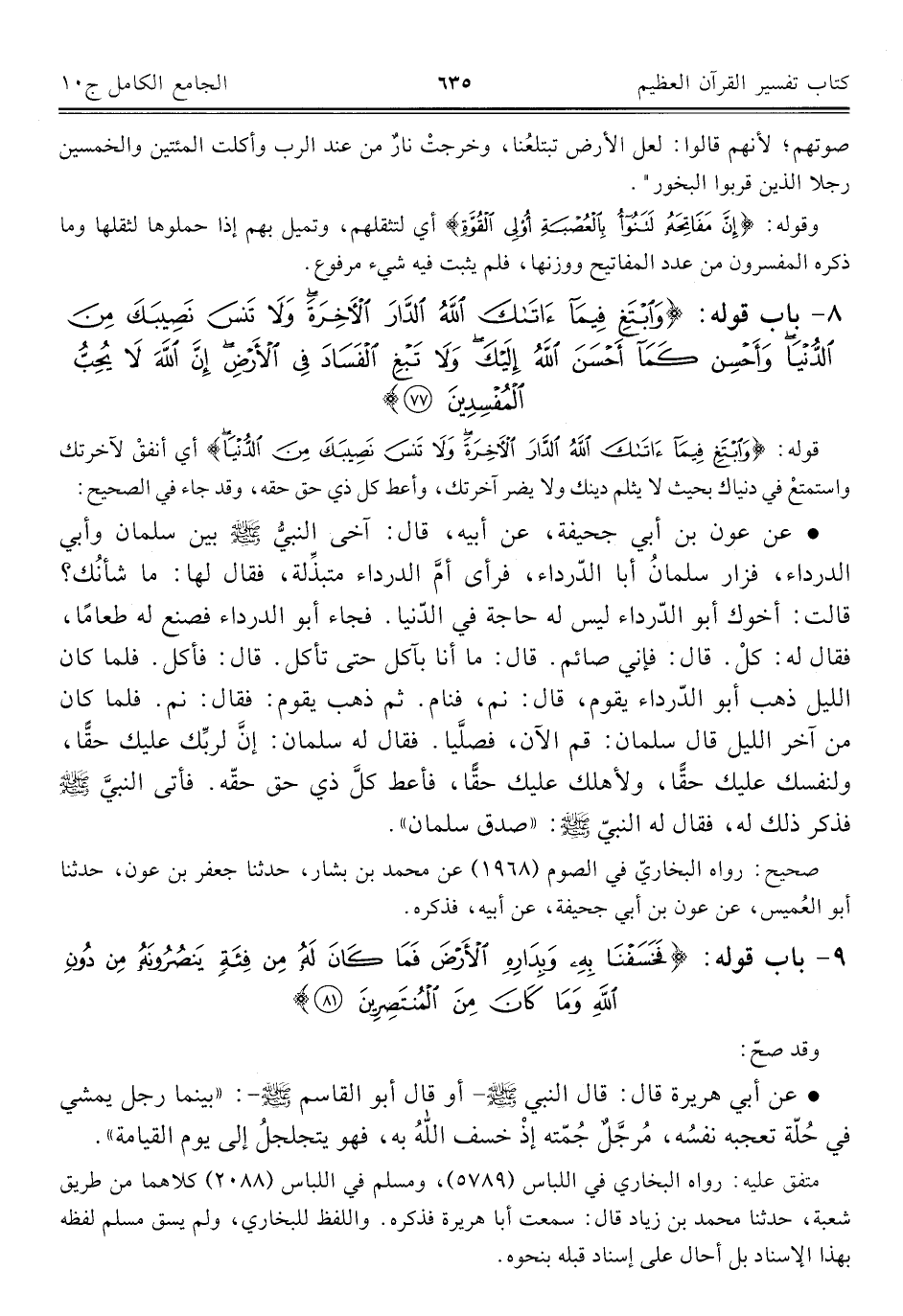 ٨ - باب قوله: {وَابْتَغِ فِيمَا آتَاكَ اللَّهُ الدَّارَ الْآخِرَةَ وَلَا تَنْسَ نَصِيبَكَ مِنَ الدُّنْيَا وَأَحْسِنْ كَمَا أَحْسَنَ اللَّهُ إِلَيْكَ وَلَا تَبْغِ الْفَسَادَ فِي الْأَرْضِ إِنَّ اللَّهَ لَا يُحِبُّ الْمُفْسِدِينَ (٧٧)}