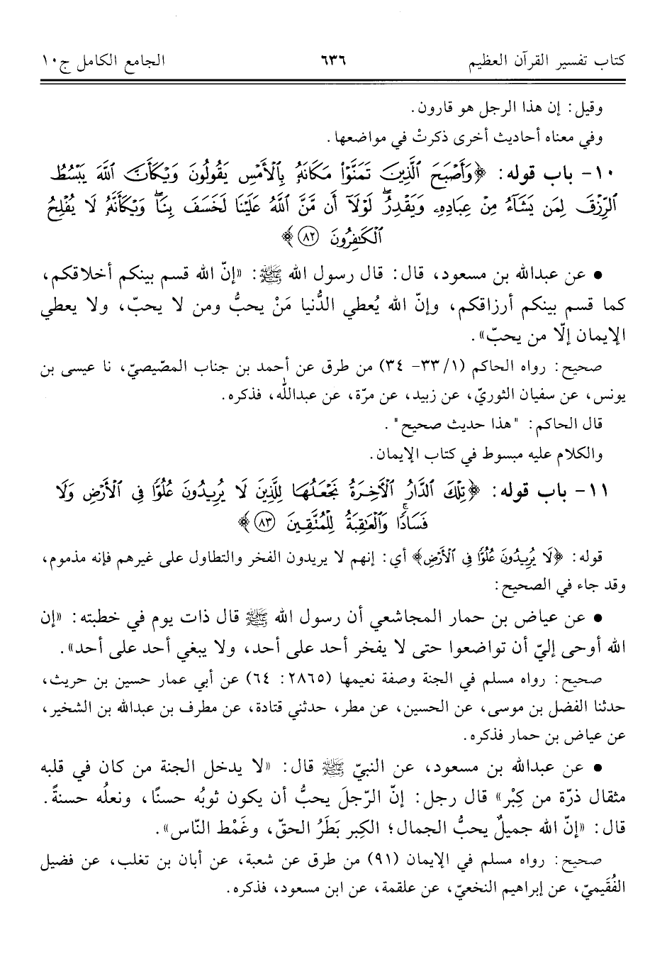 ١١ - باب قوله: {تِلْكَ الدَّارُ الْآخِرَةُ نَجْعَلُهَا لِلَّذِينَ لَا يُرِيدُونَ عُلُوًّا فِي الْأَرْضِ وَلَا فَسَادًا وَالْعَاقِبَةُ لِلْمُتَّقِينَ (٨٣)}