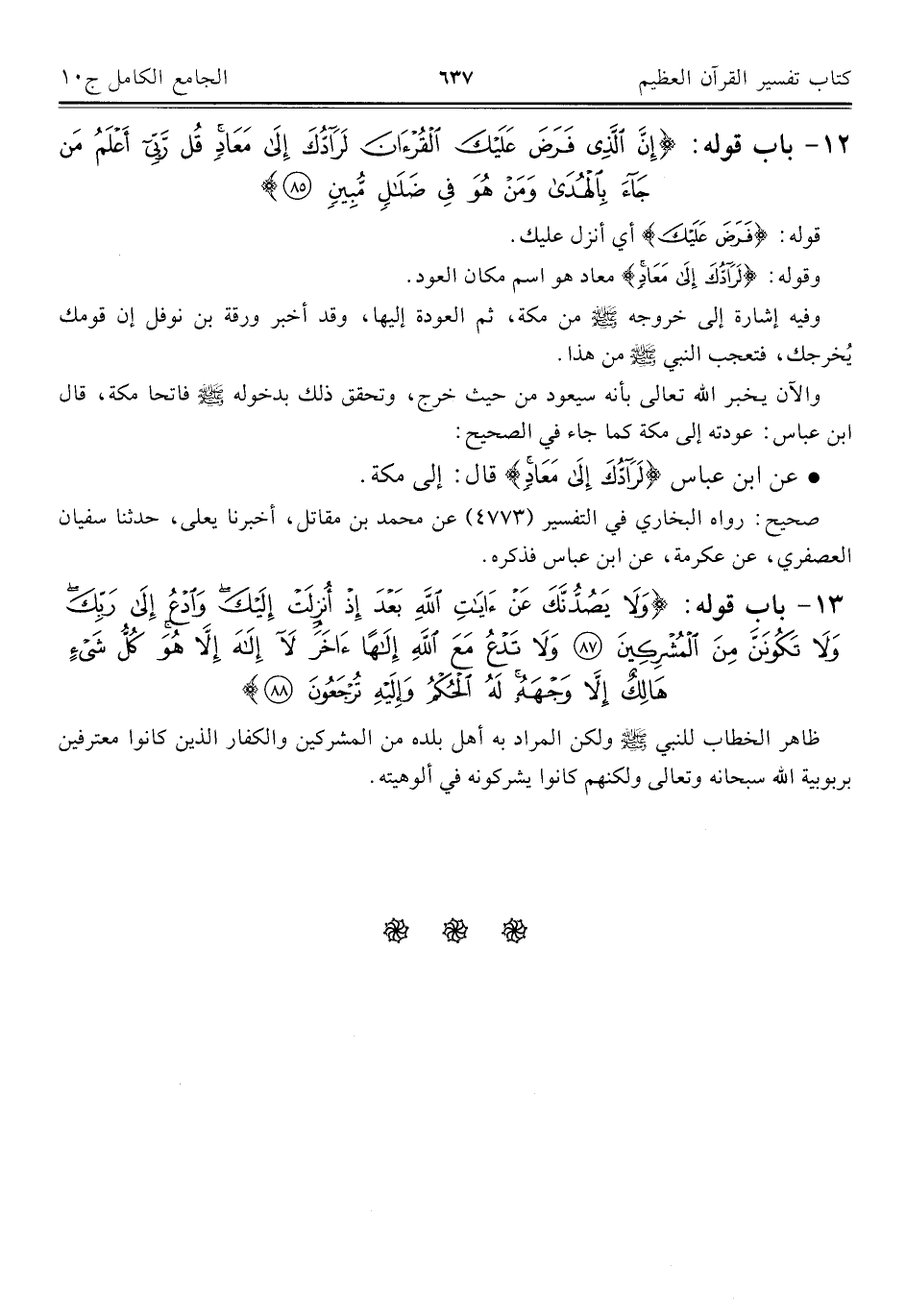 ١٢ - باب قوله: {إِنَّ الَّذِي فَرَضَ عَلَيْكَ الْقُرْآنَ لَرَادُّكَ إِلَى مَعَادٍ قُلْ رَبِّي أَعْلَمُ مَنْ جَاءَ بِالْهُدَى وَمَنْ هُوَ فِي ضَلَالٍ مُبِينٍ (٨٥)}