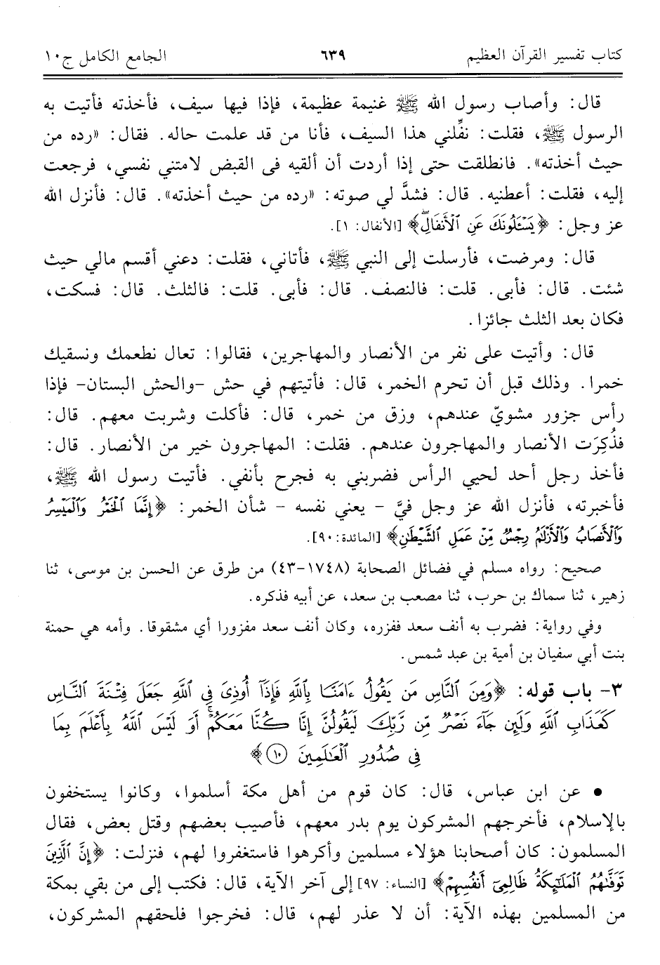 قال: وأصاب رسول الله - صلى الله عليه وسلم - غنيمة عظيمة، فإذا فيها سيف، فأخذته فأتيت به الرسول - صلى الله عليه وسلم -، فقلت: نفِّلني هذا السيف، فأنا من قد علمت حاله. فقال: "رده من حيث أخذته". فانطلقت حتى إذا أردت أن ألقيه في القبض لامتني نفسي، فرجعت إليه، فقلت: أعطنيه. قال: فشدَّ لي صوته: "رده من حيث أخذته". قال: فأنزل الله عز وجل: {يَسْأَلُونَكَ عَنِ الْأَنْفَالِ} [الأنفال: ١].