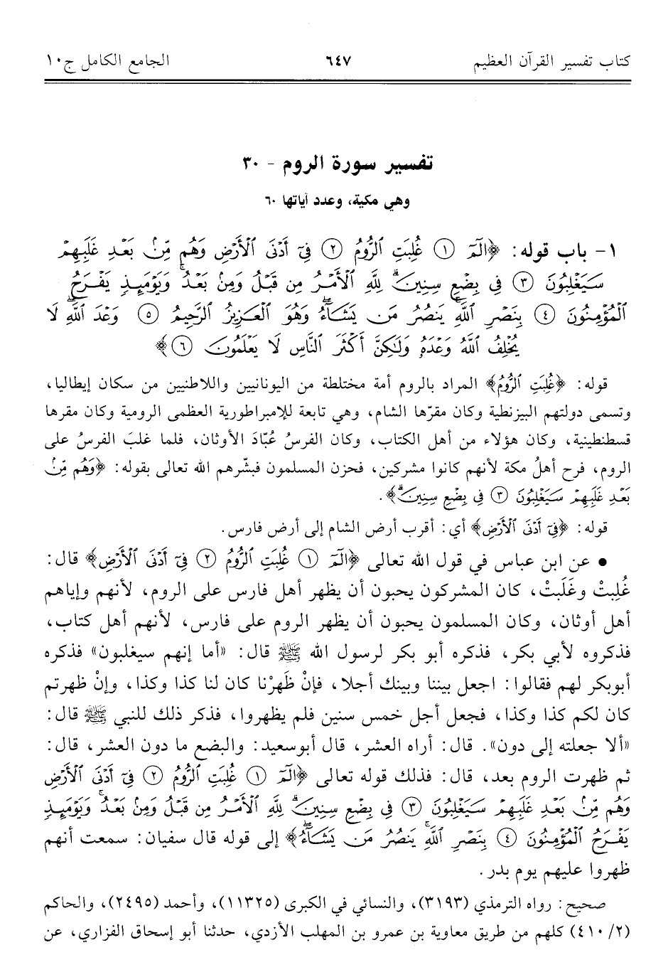 • عن ابن عباس في قول الله تعالى {الم (١) غُلِبَتِ الرُّومُ (٢) فِي أَدْنَى الْأَرْضِ} قال: غُلِبتْ وغَلَبتْ، كان المشركون يحبون أن يظهر أهل فارس على الروم، لأنهم وإياهم أهل أوثان، وكان المسلمون يحبون أن يظهر الروم على فارس، لأنهم أهل كتاب، فذكروه لأبي بكر، فذكره أبو بكر لرسول الله - صلى الله عليه وسلم - قال: "أما إنهم سيغلبون" فذكره أبو بكر لهم فقالوا: اجعل بيننا وبينك أجلا، فإنْ ظَهرْنا كان لنا كذا وكذا، وإنْ ظهرتم كان لكم كذا وكذا، فجعل أجل خمس سنين فلم يظهروا، فذكر ذلك للنبي - صلى الله عليه وسلم - قال: "ألا جعلته إلى دون". قال: أراه العشر، قال أبو سعيد: والبضع ما دون العشر، قال: ثم ظهرت الروم بعد، قال: فذلك قوله تعالى {الم (١) غُلِبَتِ الرُّومُ (٢) فِي أَدْنَى الْأَرْضِ وَهُمْ مِنْ بَعْدِ غَلَبِهِمْ سَيَغْلِبُونَ (٣) فِي بِضْعِ سِنِينَ لِلَّهِ الْأَمْرُ مِنْ قَبْلُ وَمِنْ بَعْدُ وَيَوْمَئِذٍ يَفْرَحُ الْمُؤْمِنُونَ (٤) بِنَصْرِ اللَّهِ يَنْصُرُ مَنْ يَشَاءُ} إلى قوله قال سفيان: سمعت أنهم ظهروا عليهم يوم بدر.