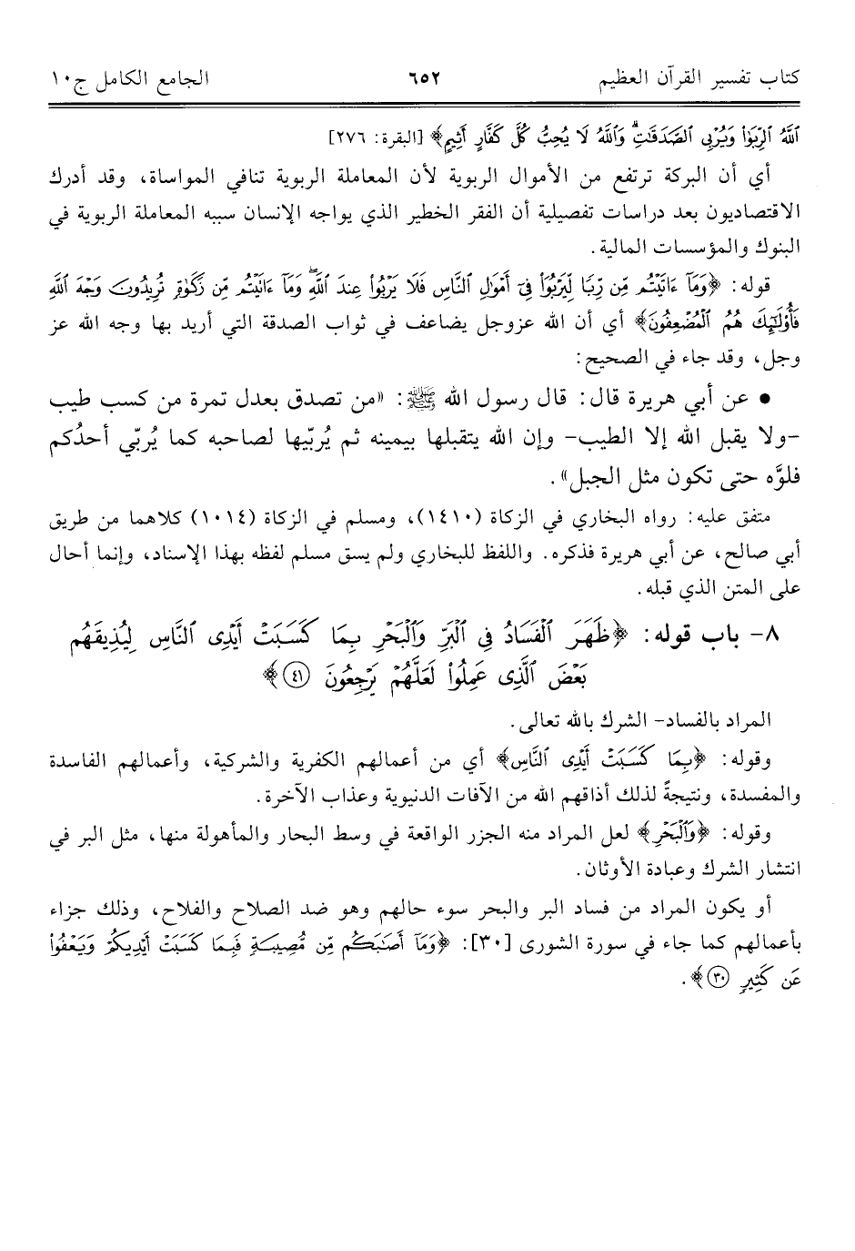قوله: {وَمَا آتَيْتُمْ مِنْ رِبًا لِيَرْبُوَ فِي أَمْوَالِ النَّاسِ فَلَا يَرْبُو عِنْدَ اللَّهِ وَمَا آتَيْتُمْ مِنْ زَكَاةٍ تُرِيدُونَ وَجْهَ اللَّهِ فَأُولَئِكَ هُمُ الْمُضْعِفُونَ} أي أن الله عز وجل يضاعف في ثواب الصدقة التي أريد بها وجه الله عز وجل، وقد جاء في الصحيح: