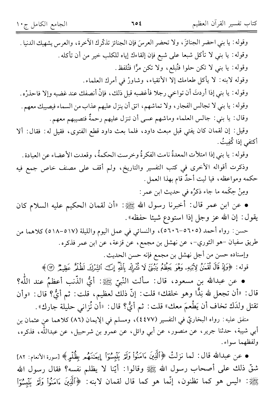 قوله: {وَإِذْ قَالَ لُقْمَانُ لابْنِهِ وَهُوَ يَعِظُهُ يَابُنَيَّ لَا تُشْرِكْ بِاللَّهِ إِنَّ الشِّرْكَ لَظُلْمٌ عَظِيمٌ (١٣)}.