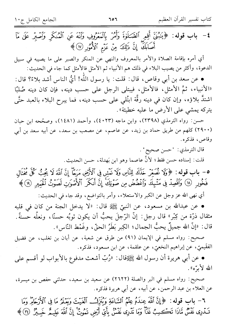 ٤ - باب قوله: {يَابُنَيَّ أَقِمِ الصَّلَاةَ وَأْمُرْ بِالْمَعْرُوفِ وَانْهَ عَنِ الْمُنْكَرِ وَاصْبِرْ عَلَى مَا أَصَابَكَ إِنَّ ذَلِكَ مِنْ عَزْمِ الْأُمُورِ (١٧)}