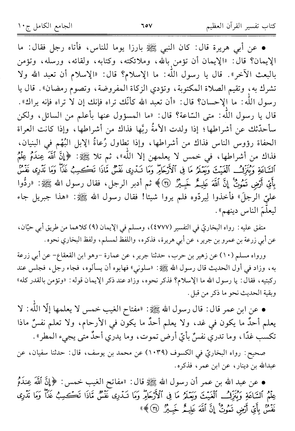• عن أبي هريرة قال: كان النبي - صلى الله عليه وسلم - بارزا يوما للناس، فأتاه رجل فقال: ما الإيمان؟ قال: "الإيمان أن تؤمن بالله، وملائكته، وكتابه، ولقائه، ورسله، وتؤمن بالبعث الآخر". قال يا رسول الله: ما الإسلام؟ قال: "الإسلام أن تعبد الله ولا تشرك به، وتقيم الصلاة المكتوبة، وتؤدي الزكاة المفروضة، وتصوم رمضان. قال يا رسول الله: ما الإحسان؟ قال: "أن تعبد الله كأنّك تراه فإنك إن لا تراه فإنه يراك". قال يا رسول الله: متى السّاعة؟ قال: "ما المسؤول عنها بأعلم من السائل، ولكن سأحدّثك عن أشراطها؛ إذا ولدت الأمةُ ربَّها فذاك من أشراطها، وإذا كانت العراة الحفاة رؤوس الناس فذاك من أشراطها، وإذا تطاول رُعاةُ الإبل البُهْم في البنيان، فذاك من أشراطها، في خمس لا يعلمهن إلا الله"، ثم تلا - صلى الله عليه وسلم -: {إِنَّ اللَّهَ عِنْدَهُ عِلْمُ السَّاعَةِ وَيُنَزِّلُ الْغَيْثَ وَيَعْلَمُ مَا فِي الْأَرْحَامِ وَمَا تَدْرِي نَفْسٌ مَاذَا تَكْسِبُ غَدًا وَمَا تَدْرِي نَفْسٌ بِأَيِّ أَرْضٍ تَمُوتُ إِنَّ اللَّهَ عَلِيمٌ خَبِيرٌ (٣٤)} ثم أدبر الرجل، فقال رسول الله - صلى الله عليه وسلم -: "ردُّوا عليّ الرجلَ" فأخذوا لِيردّوه فلم يروا شيئًا! فقال رسول الله - صلى الله عليه وسلم -: "هذا جبريل جاء ليعلّمَ الناس دينهم".