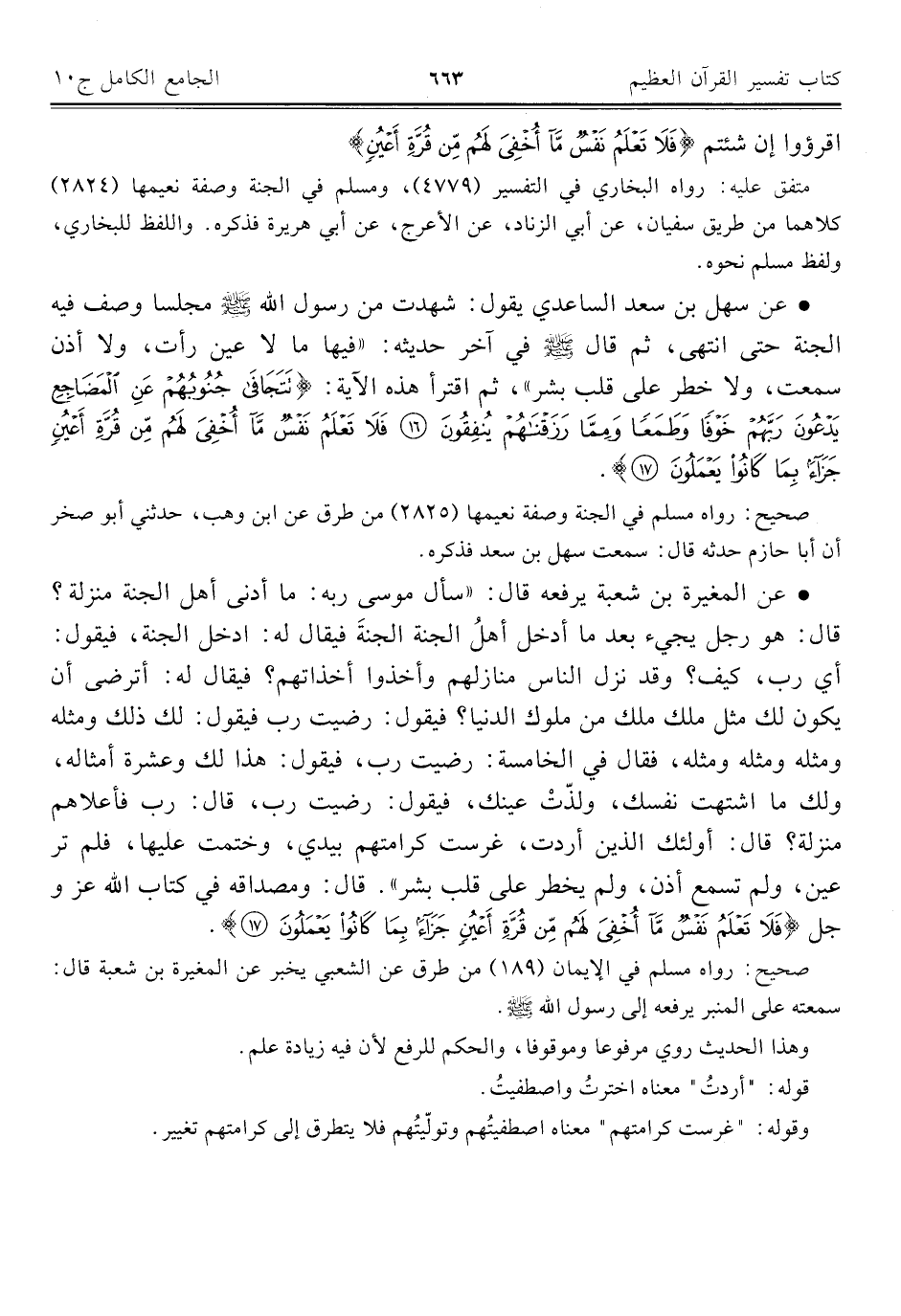 • عن سهل بن سعد الساعدي يقول: شهدت من رسول الله - صلى الله عليه وسلم - مجلسا وصف فيه الجنة حتى انتهى، ثم قال - صلى الله عليه وسلم - في آخر حديثه: "فيها ما لا عين رأت، ولا أذن سمعت، ولا خطر على قلب بشر"، ثم اقترأ هذه الآية: {تَتَجَافَى جُنُوبُهُمْ عَنِ الْمَضَاجِعِ يَدْعُونَ رَبَّهُمْ خَوْفًا وَطَمَعًا وَمِمَّا رَزَقْنَاهُمْ يُنْفِقُونَ (١٦) فَلَا تَعْلَمُ نَفْسٌ مَا أُخْفِيَ لَهُمْ مِنْ قُرَّةِ أَعْيُنٍ جَزَاءً بِمَا كَانُوا يَعْمَلُونَ (١٧)}.