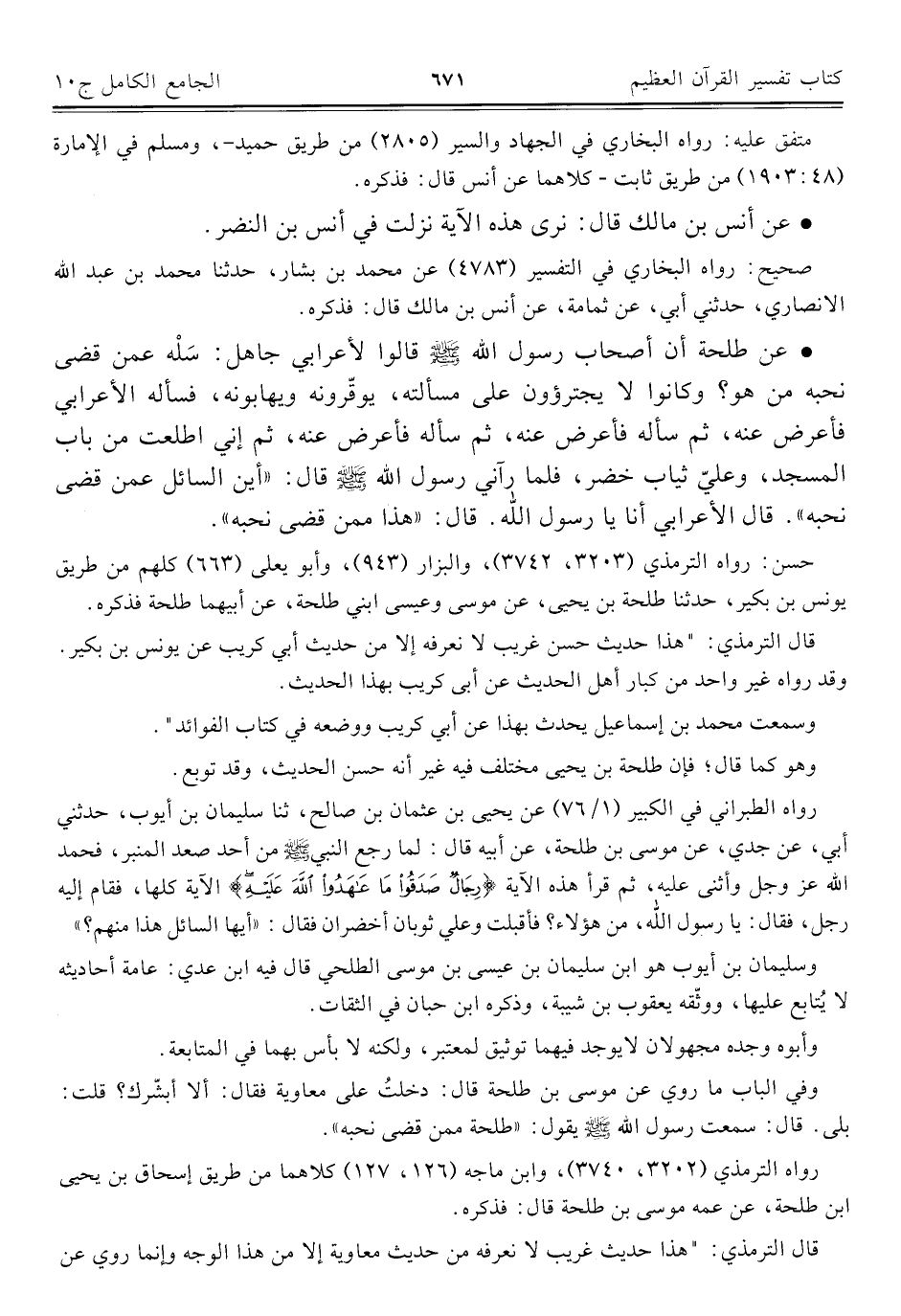 رواه الطبراني في الكبير (١/ ٧٦) عن يحيى بن عثمان بن صالح، ثنا سليمان بن أيوب، حدثني أبي، عن جدي، عن موسى بن طلحة، عن أبيه قال: لما رجع النبي - صلى الله عليه وسلم - من أحد صعد المنبر، فحمد الله عز وجل وأثنى عليه، ثم قرأ هذه الآية {رِجَالٌ صَدَقُوا مَا عَاهَدُوا اللَّهَ عَلَيْهِ} الآية كلها، فقام إليه رجل، فقال: يا رسول الله، من هؤلاء؟ فأقبلت وعلي ثوبان أخضران فقال: "أيها السائل هذا منهم؟ "