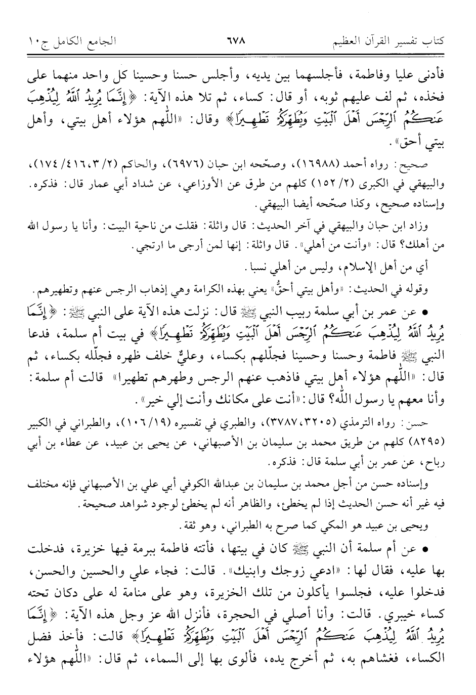 • عن عمر بن أبي سلمة ربيب النَّبِيّ - صلى الله عليه وسلم - قال: نزلت هذه الآية على النَّبِيّ - صلى الله عليه وسلم -: {إِنَّمَا يُرِيدُ اللَّهُ لِيُذْهِبَ عَنْكُمُ الرِّجْسَ أَهْلَ الْبَيْتِ وَيُطَهِّرَكُمْ تَطْهِيرًا} في بيت أم سلمة، فدعا النَّبِيّ - صلى الله عليه وسلم - فاطمة وحسنا وحسينا فجلّلهم بكساء، وعليٌّ خلف ظهره فجلّله بكساء، ثمّ قال: "اللهم هؤلاء أهل بيتي فاذهب عنهم الرجس وطهرهم تطهيرا" قالت أم سلمة: وأنا معهم يا رسول الله؟ قال: "أنت على مكانك وأنت إلي خير".