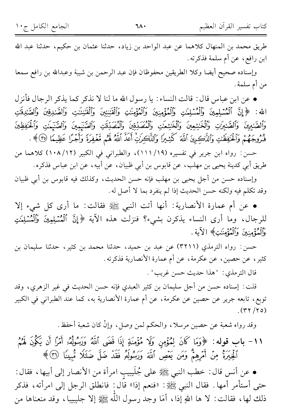 • عن أم عمارة الأنصارية: أنها أتت النَّبِيّ - صلى الله عليه وسلم - فقالت: ما أرى كل شيء إِلَّا للرجال، وما أرى النساء يذكرن بشيء؟ فنزلت هذه الآية {إِنَّ الْمُسْلِمِينَ وَالْمُسْلِمَاتِ وَالْمُؤْمِنِينَ وَالْمُؤْمِنَاتِ} الآية.