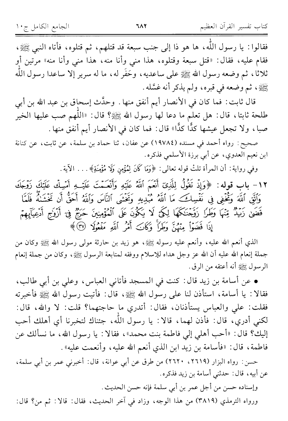 الذي أنعم الله عليه، وأنعم عليه رسوله - صلى الله عليه وسلم -، هو زيد بن حارثة مولى رسول الله - صلى الله عليه وسلم - وكان من جملة إنعام الله عليه أن الله عَزَّ وَجَلَّ هداه للإسلام ووفقه لمتابعة الرسول - صلى الله عليه وسلم -، وكان من جملة إنعام الرسول - صلى الله عليه وسلم - أنه أعتقه من الرق.