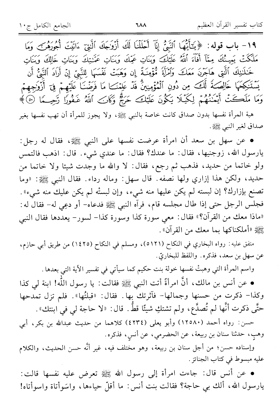 ١٩ - باب قوله: {يَاأَيُّهَا النَّبِيُّ إِنَّا أَحْلَلْنَا لَكَ أَزْوَاجَكَ اللَّاتِي آتَيْتَ أُجُورَهُنَّ وَمَا مَلَكَتْ يَمِينُكَ مِمَّا أَفَاءَ اللَّهُ عَلَيْكَ وَبَنَاتِ عَمِّكَ وَبَنَاتِ عَمَّاتِكَ وَبَنَاتِ خَالِكَ وَبَنَاتِ خَالَاتِكَ اللَّاتِي هَاجَرْنَ مَعَكَ وَامْرَأَةً مُؤْمِنَةً إِنْ وَهَبَتْ نَفْسَهَا لِلنَّبِيِّ إِنْ أَرَادَ النَّبِيُّ أَنْ يَسْتَنْكِحَهَا خَالِصَةً لَكَ مِنْ دُونِ الْمُؤْمِنِينَ قَدْ عَلِمْنَا مَا فَرَضْنَا عَلَيْهِمْ فِي أَزْوَاجِهِمْ وَمَا مَلَكَتْ أَيْمَانُهُمْ لِكَيْلَا يَكُونَ عَلَيْكَ حَرَجٌ وَكَانَ اللَّهُ غَفُورًا رَحِيمًا (٥٠)}