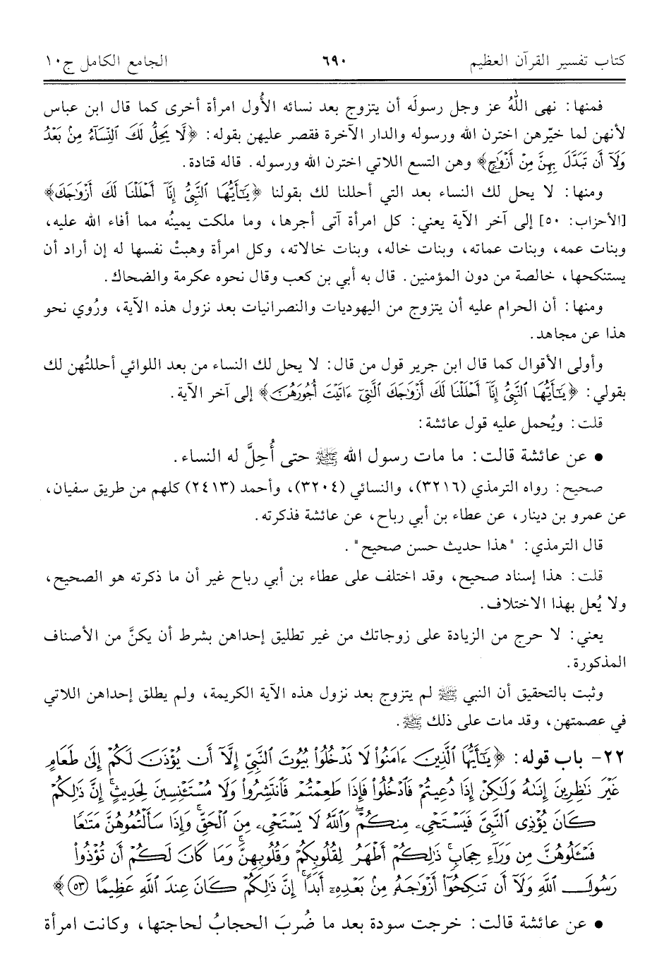 وثبت بالتحقيق أن النَّبِيّ - صلى الله عليه وسلم - لم يتزوج بعد نزول هذه الآية الكريمة، ولم يطلق إحداهن اللاتي في عصمتهن، وقد مات على ذلك - صلى الله عليه وسلم -.