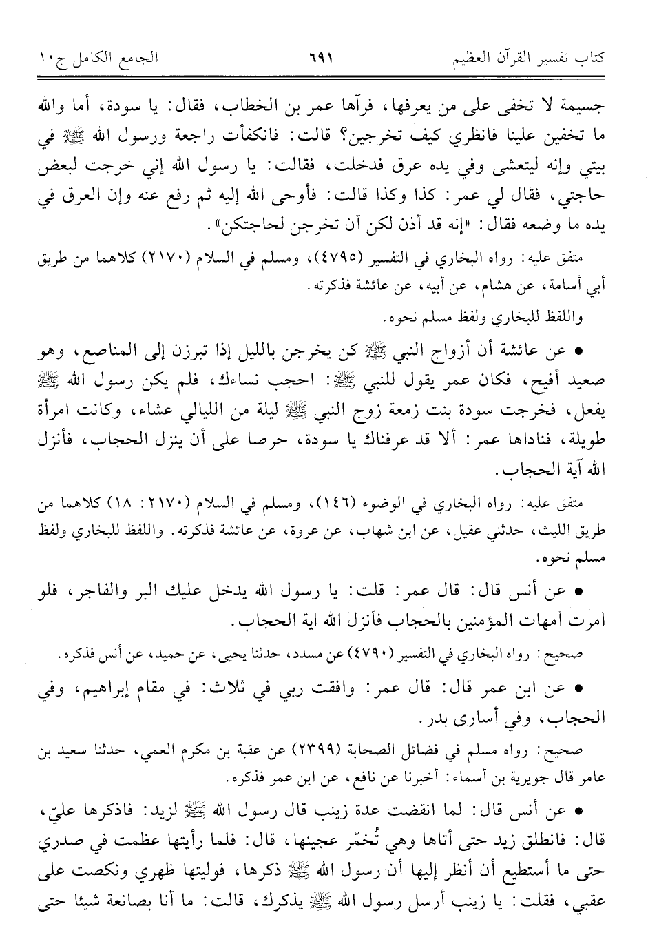 • عن عائشة أن أزواج النَّبِيّ - صلى الله عليه وسلم - كن يخرجن بالليل إذا تبرزن إلى المناصع، وهو صعيد أفيح، فكان عمر يقول للنبي - صلى الله عليه وسلم -: احجب نساءك، فلم يكن رسول الله - صلى الله عليه وسلم - يفعل، فخرجت سودة بنت زمعة زوج النَّبِيّ - صلى الله عليه وسلم - ليلة من الليالي عشاء، وكانت امرأة طويلة، فناداها عمر: ألا قد عرفناك يا سودة، حرصا على أن ينزل الحجاب، فأنزل الله آية الحجاب.