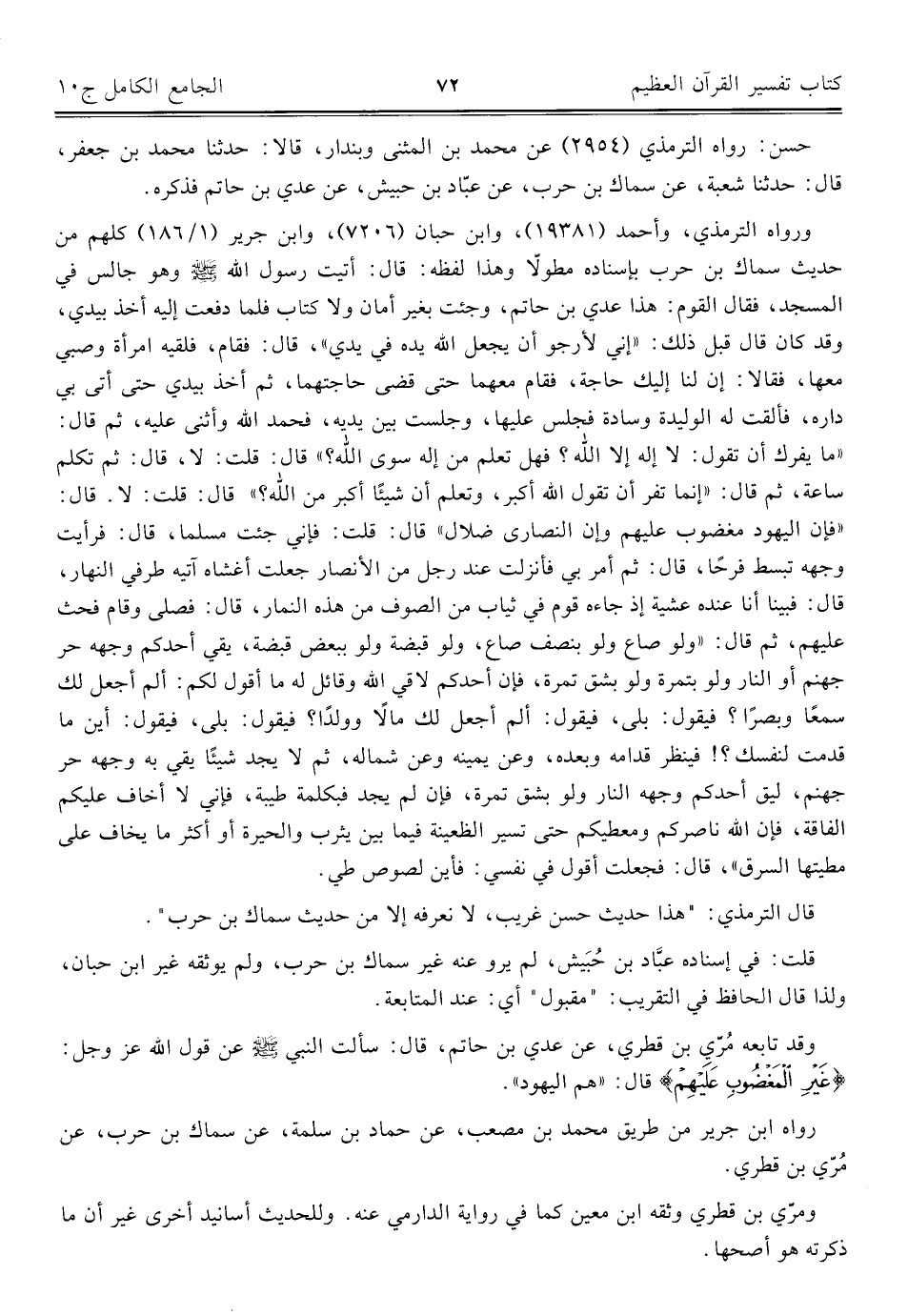 حسن: رواه الترمذيّ (٢٩٥٤) عن محمد بن المثنى وبندار، قالا: حدّثنا محمد بن جعفر، قال: حدّثنا شعبة، عن سماك بن حرب، عن عبّاد بن حبيش، عن عدي بن حاتم فذكره.