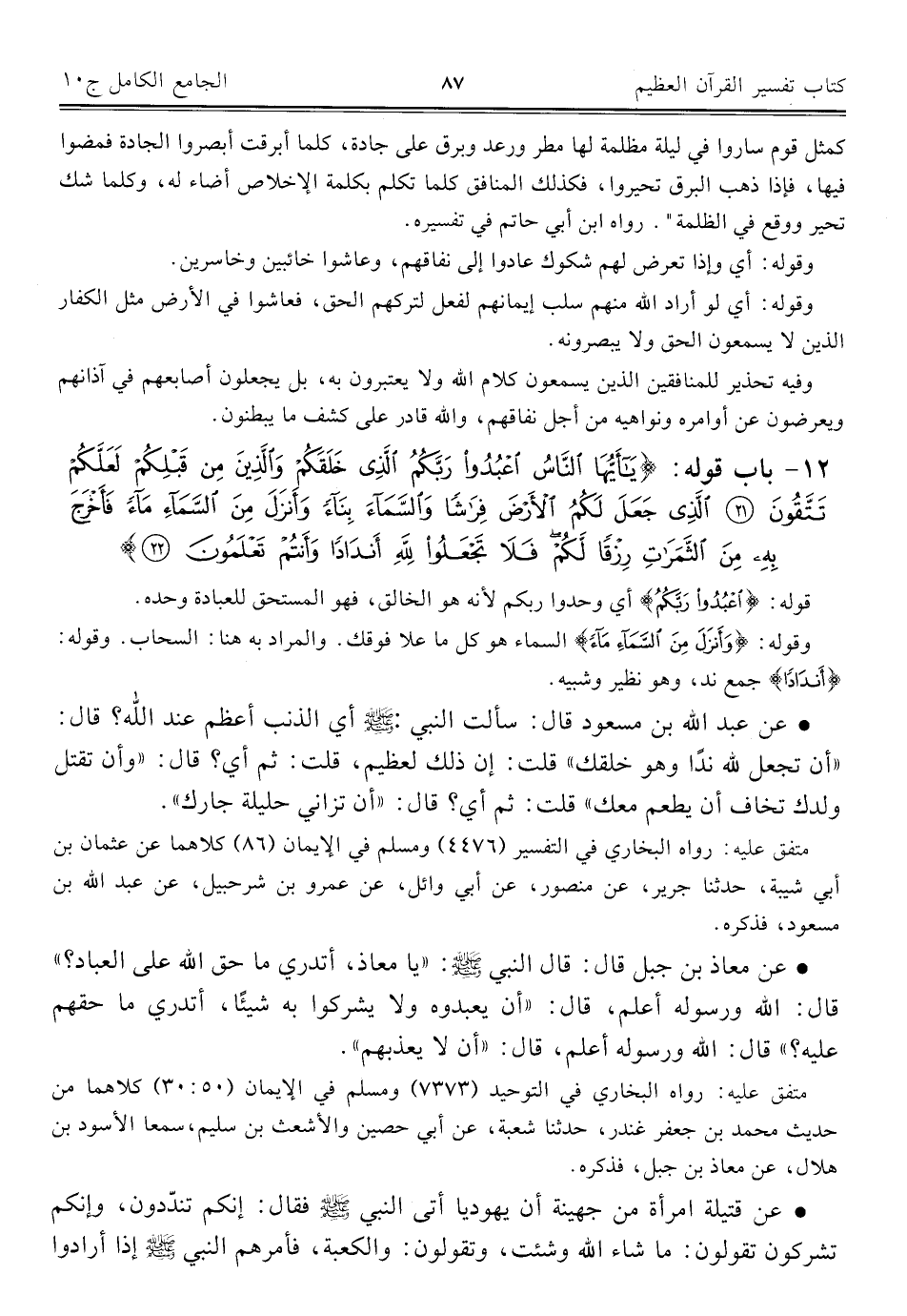 ١٢ - باب قوله: {يَاأَيُّهَا النَّاسُ اعْبُدُوا رَبَّكُمُ الَّذِي خَلَقَكُمْ وَالَّذِينَ مِنْ قَبْلِكُمْ لَعَلَّكُمْ تَتَّقُونَ (٢١) الَّذِي جَعَلَ لَكُمُ الْأَرْضَ فِرَاشًا وَالسَّمَاءَ بِنَاءً وَأَنْزَلَ مِنَ السَّمَاءِ مَاءً فَأَخْرَجَ بِهِ مِنَ الثَّمَرَاتِ رِزْقًا لَكُمْ فَلَا تَجْعَلُوا لِلَّهِ أَنْدَادًا وَأَنْتُمْ تَعْلَمُونَ (٢٢)}