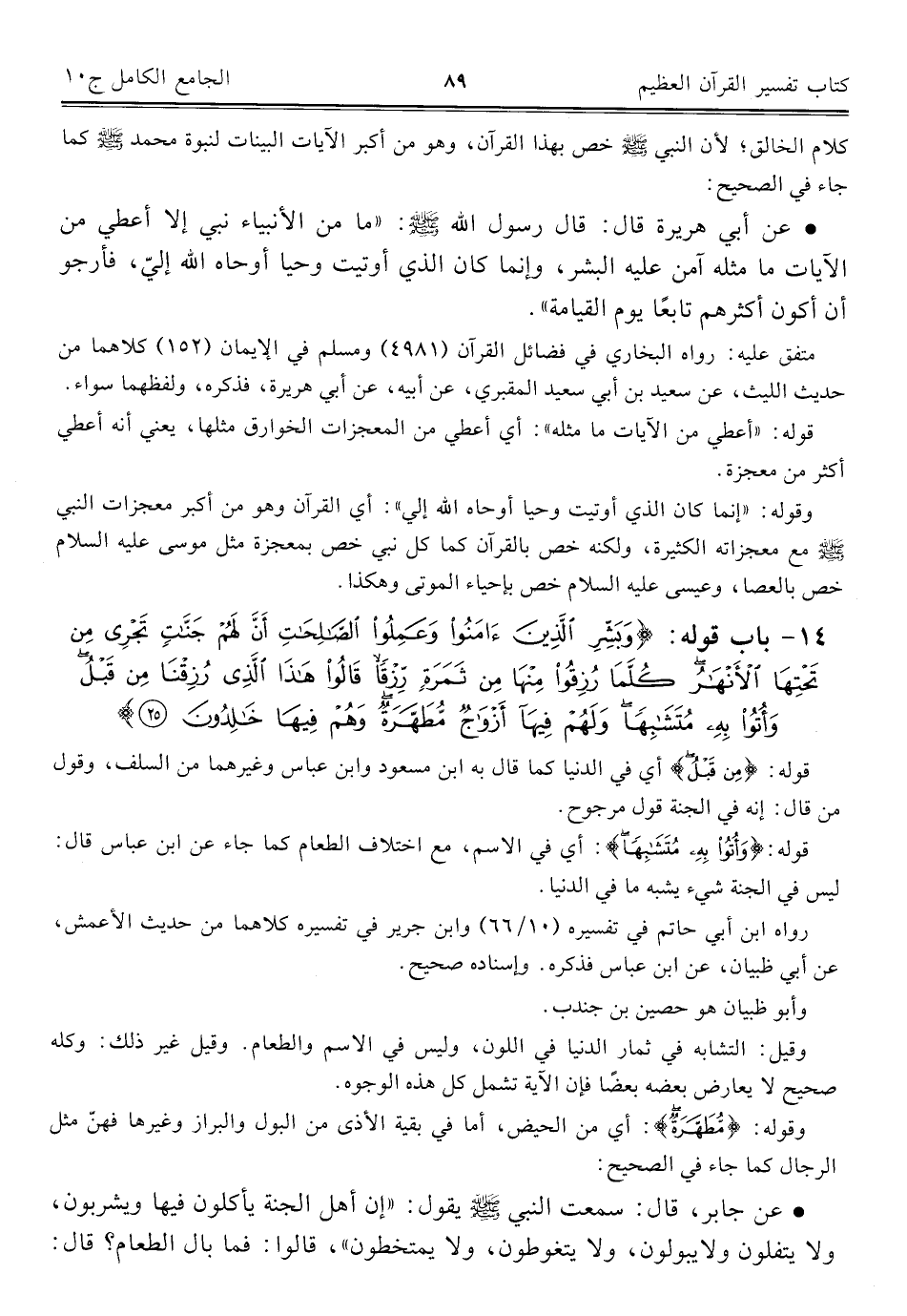 ١٤ - باب قوله: {وَبَشِّرِ الَّذِينَ آمَنُوا وَعَمِلُوا الصَّالِحَاتِ أَنَّ لَهُمْ جَنَّاتٍ تَجْرِي مِنْ تَحْتِهَا الْأَنْهَارُ كُلَّمَا رُزِقُوا مِنْهَا مِنْ ثَمَرَةٍ رِزْقًا قَالُوا هَذَا الَّذِي رُزِقْنَا مِنْ قَبْلُ وَأُتُوا بِهِ مُتَشَابِهًا وَلَهُمْ فِيهَا أَزْوَاجٌ مُطَهَّرَةٌ وَهُمْ فِيهَا خَالِدُونَ (٢٥)}